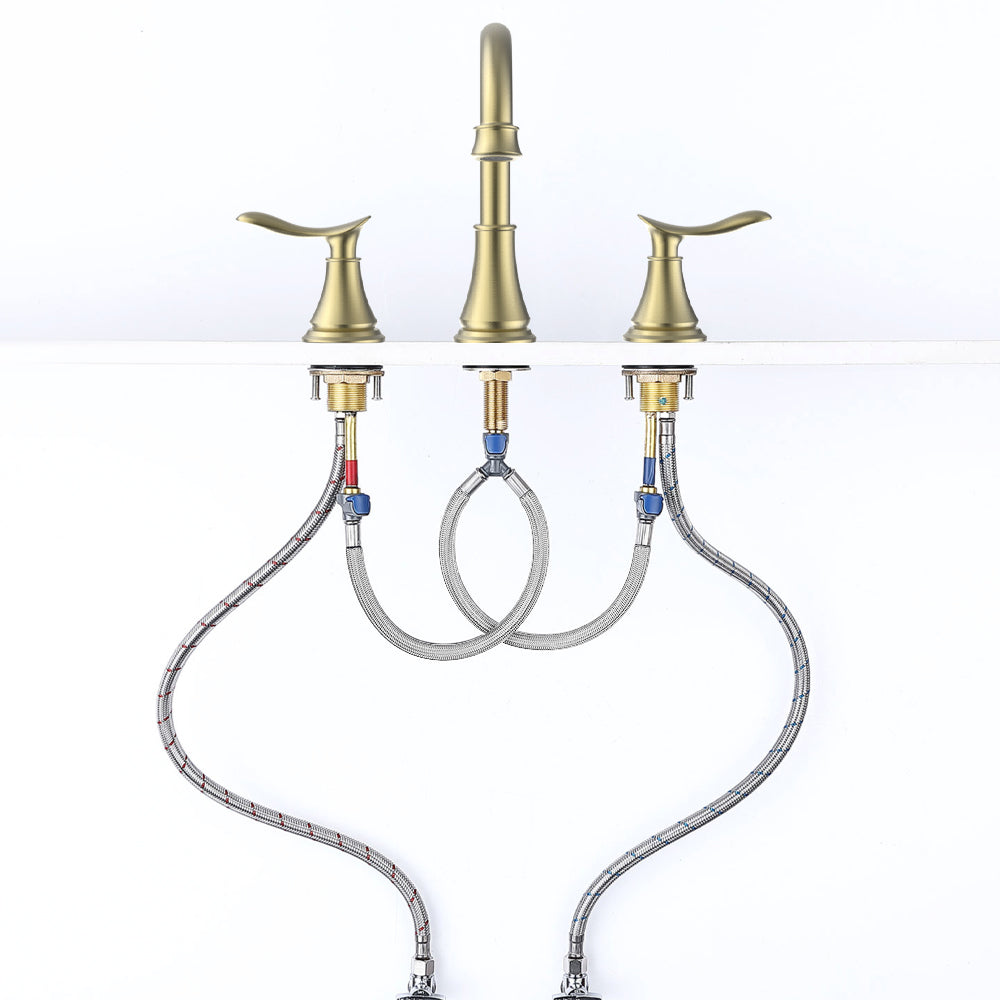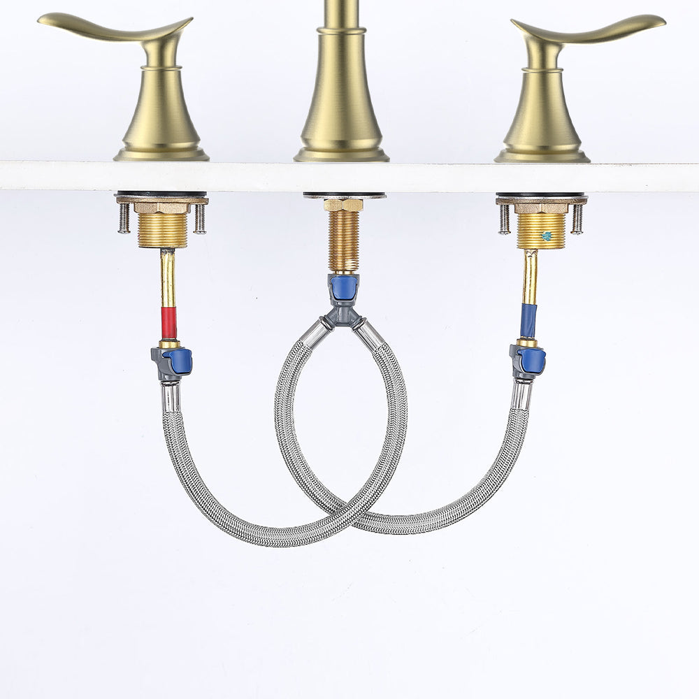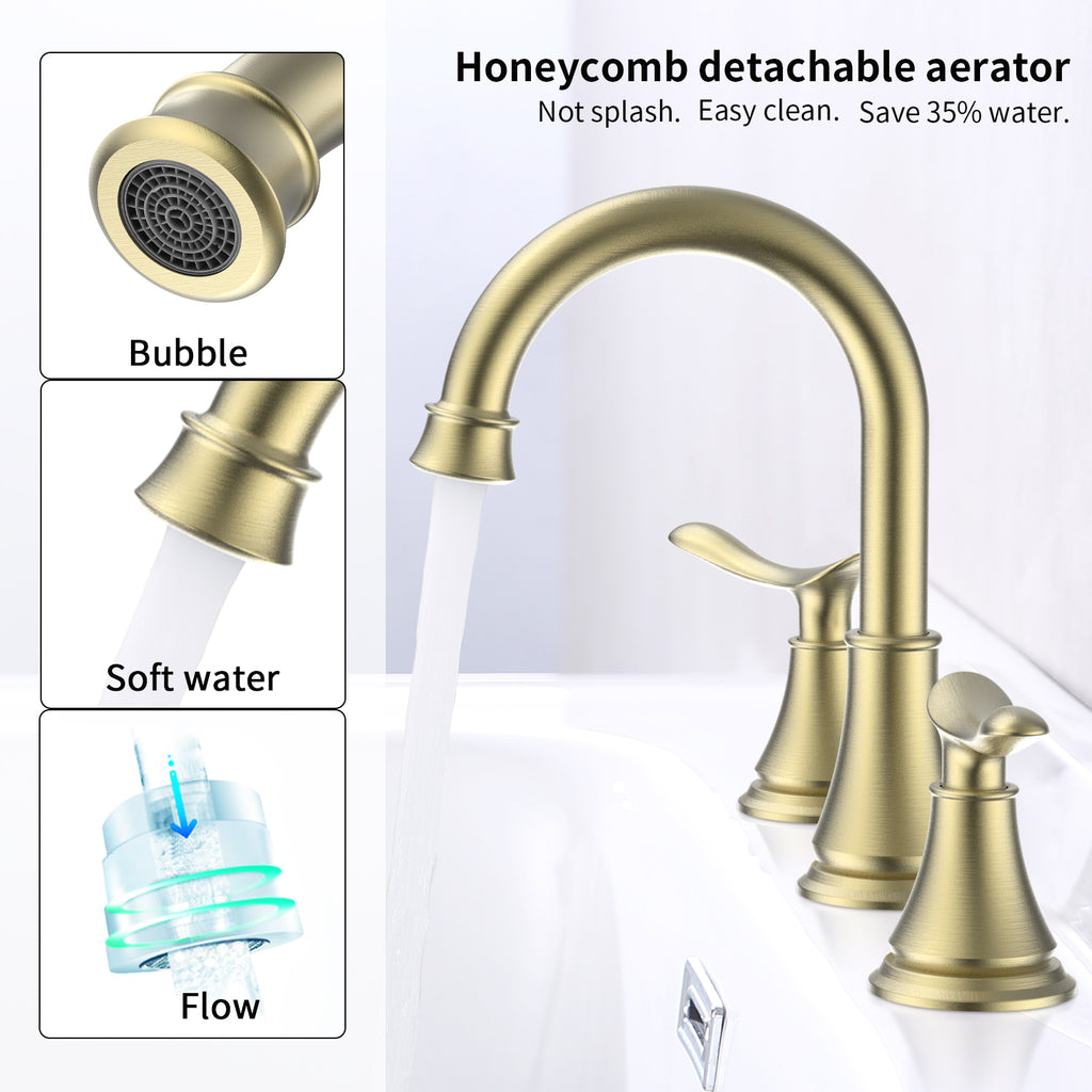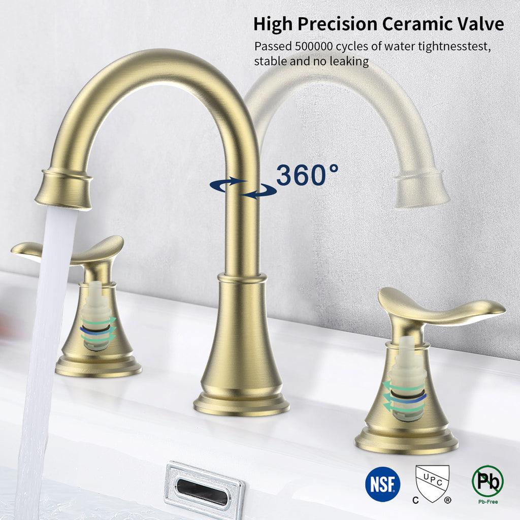 - 【 PREMIUM MATERIAL 】- Exquisite widespread bathroom faucet in brushed gold finish, shiny surface, anti-scratch, resist corrosion, no water spot and finger print, solid brass connector ensures long time using. Exceed industry longevity standards, ensuring durable performance for life.
