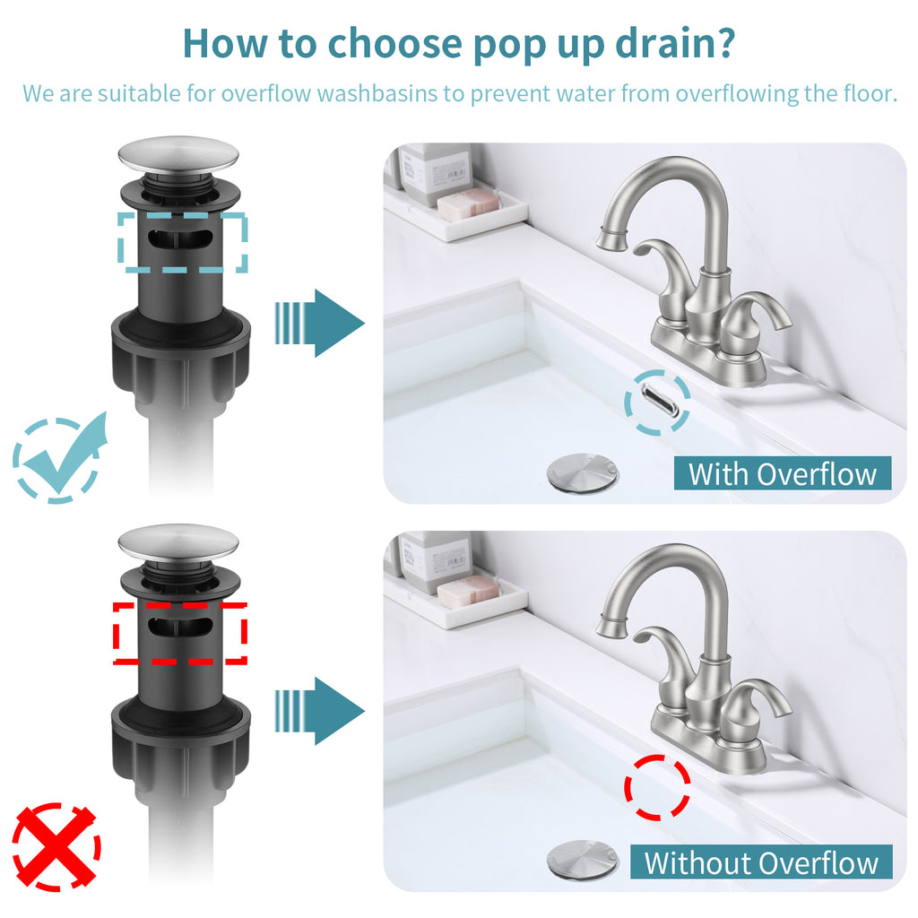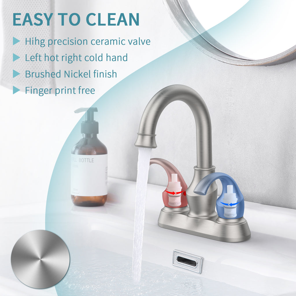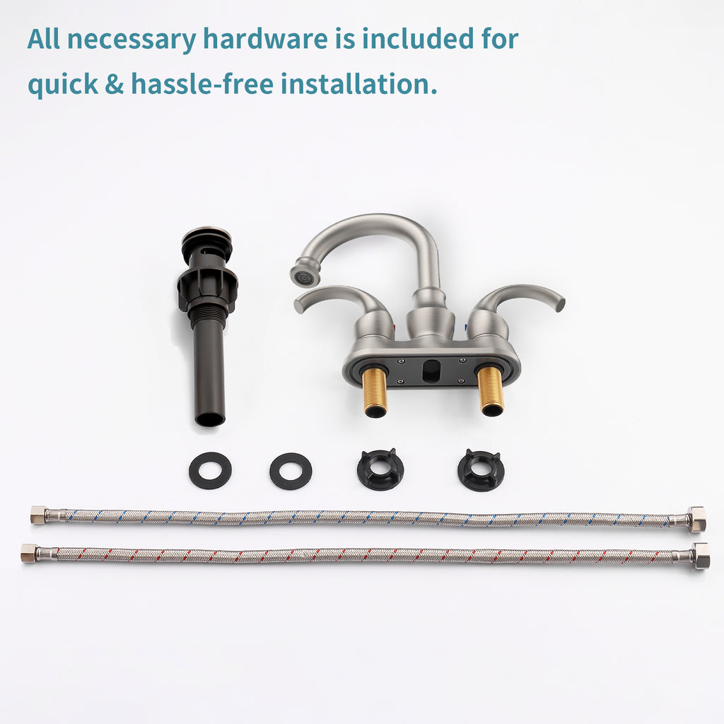 - ♥EASY TO INSTALL: The Bathroom sink Faucet is 2/3-hole, 4inch centerset design with water supply hoses and plastic Pop-up Drain which is uses the standard universal ports, convenient and safe. Please read the instructions and product details before installation.