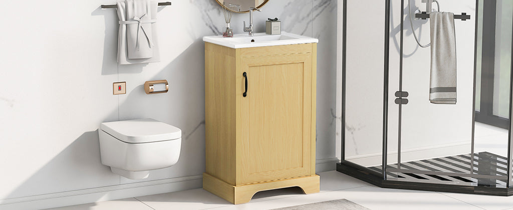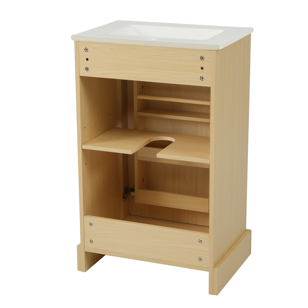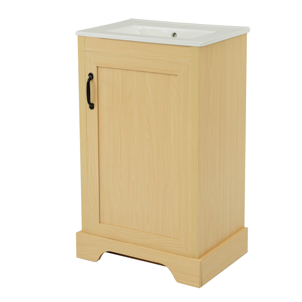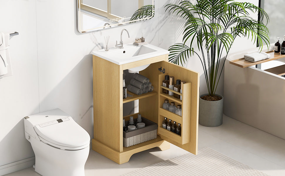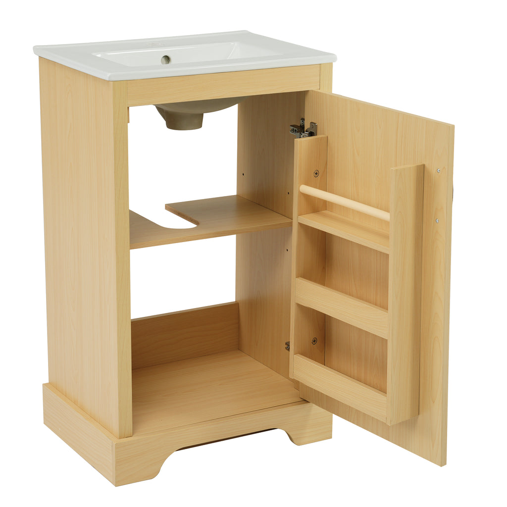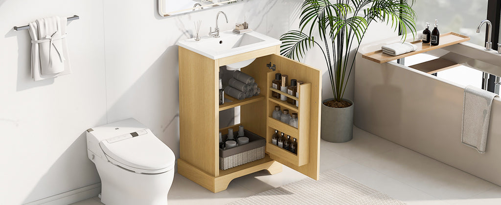 - Vanity with Cabinet & Storage Rack & Adjustable Shelve - This bathroom vanity has ample storage space: one cabinet with door, three-tier storage rack on the door, and adjustable shelve. You can put soaps, towels, shampoos, tissue paper and other bathroom essentials in it so to keep them away from dust.
