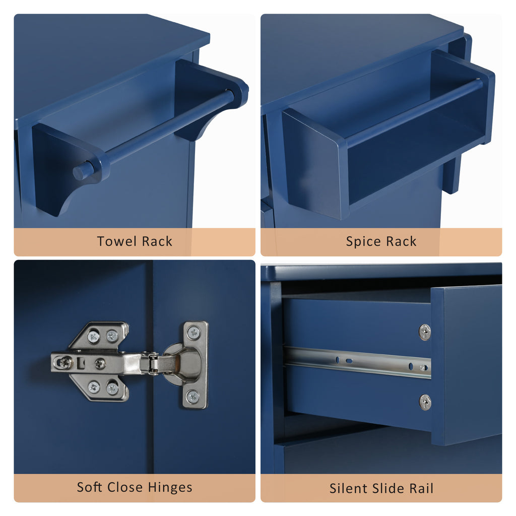 | Highlights | [Ample Storage Space][Drop Leaf] [Three Doors + Two Drawers][Adjustable Shelves] [5*360°Smooth Rotation Wheels with 2 Lockable] [Stationary Cabinet Feet][Concealed Handles] [Towel Rack][Spice Rack] [Eco-friendly manufactured MDF] |