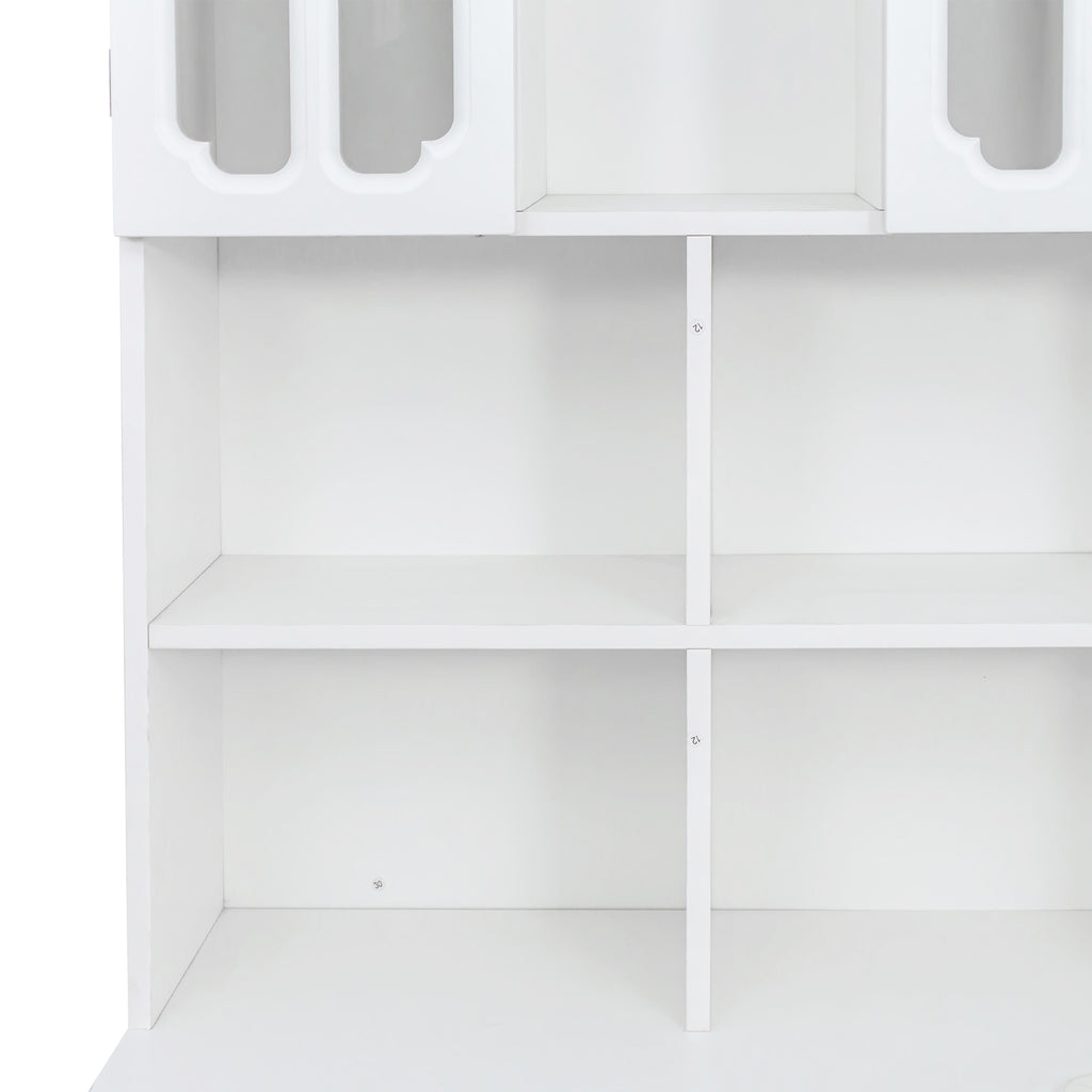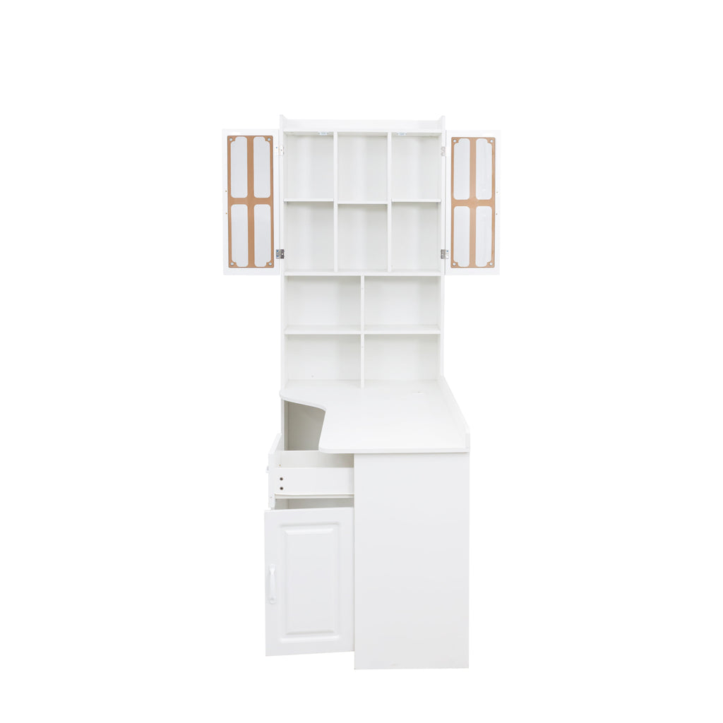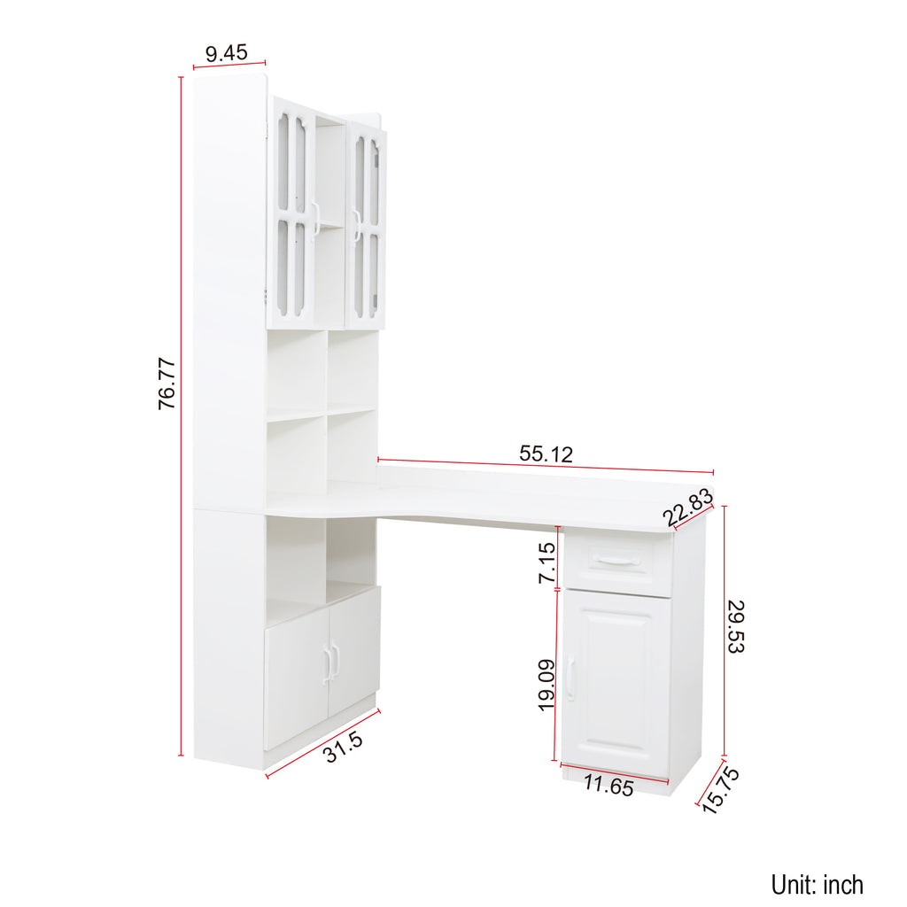 Ample Storage Space Coming with tier open shelf, 4 cabinets and 1 drawer, with powerful storage space. This computer desk is economic, meets different storage need, makes your office neat and tidy. 2-in-1 L-Shaped Design This white corner desk is space-saving,it combines desk with storage cabinet into one, it's convenient to make everything within reach. Large Working Space This L-shaped computer desk offers adequate working space. The wide desktop can hold many office supplies, such as monitors, table lamp, books, files, etc. Lower shelf is the ideal place to set printer, multiple monitors, plants. This computer desk is suitable for study room, bedroom, living room and office.