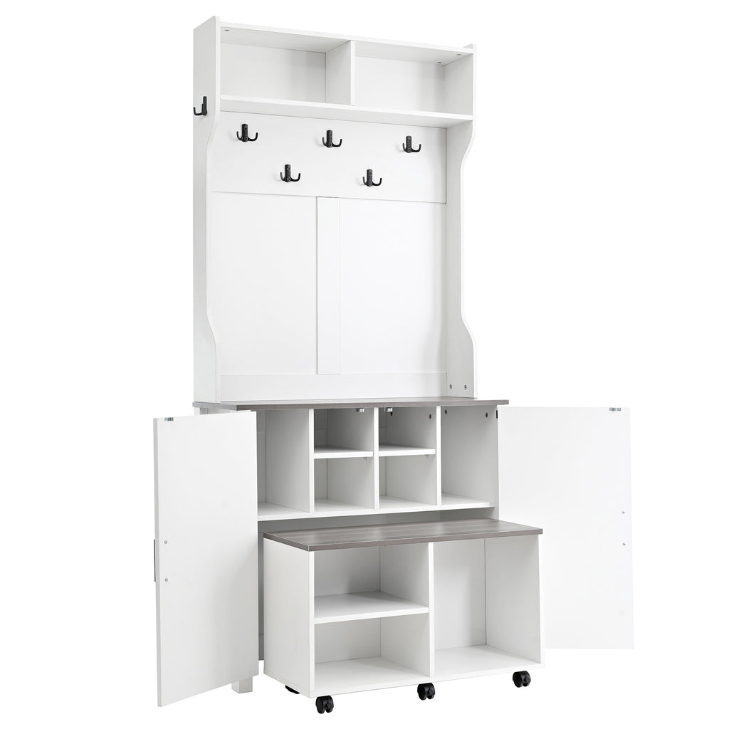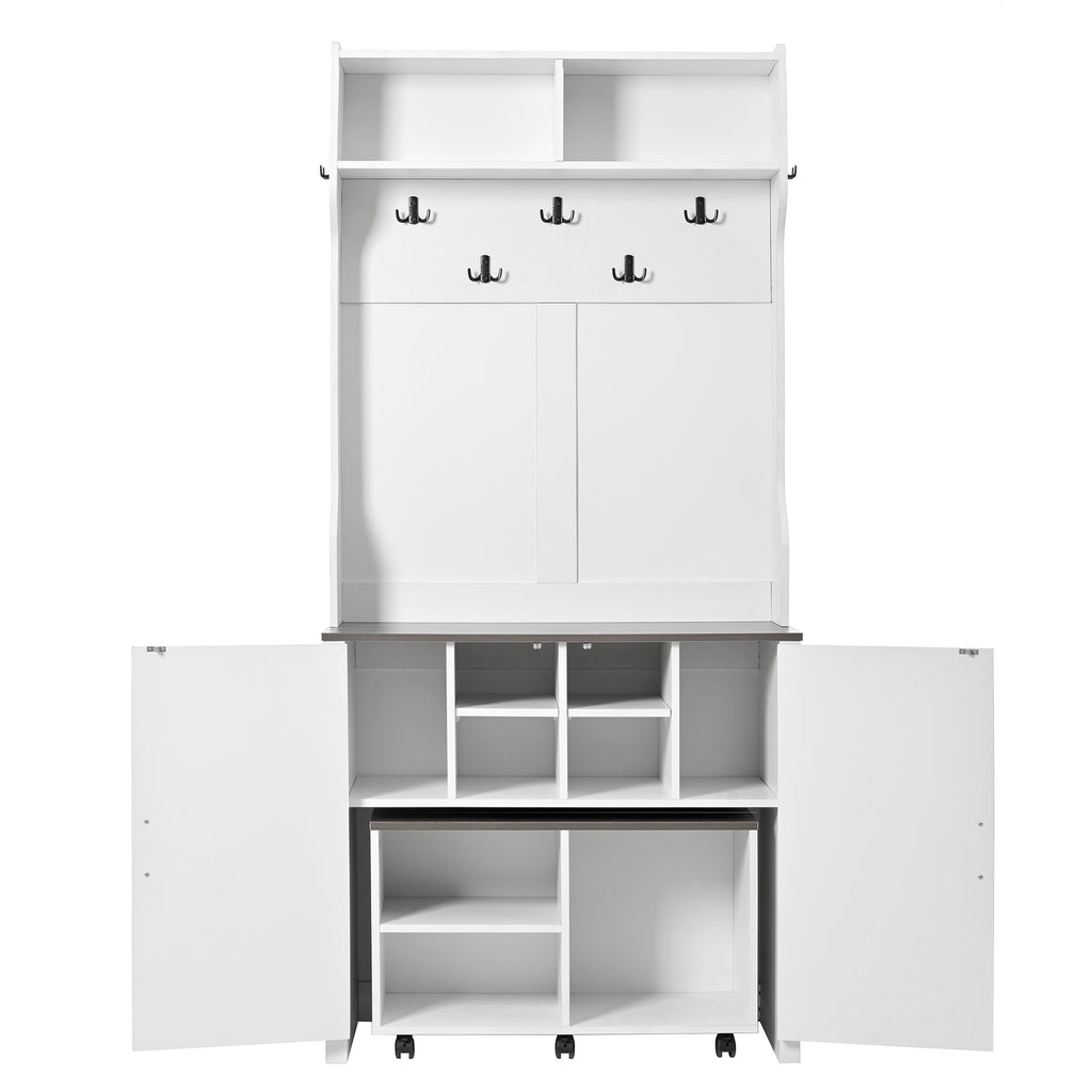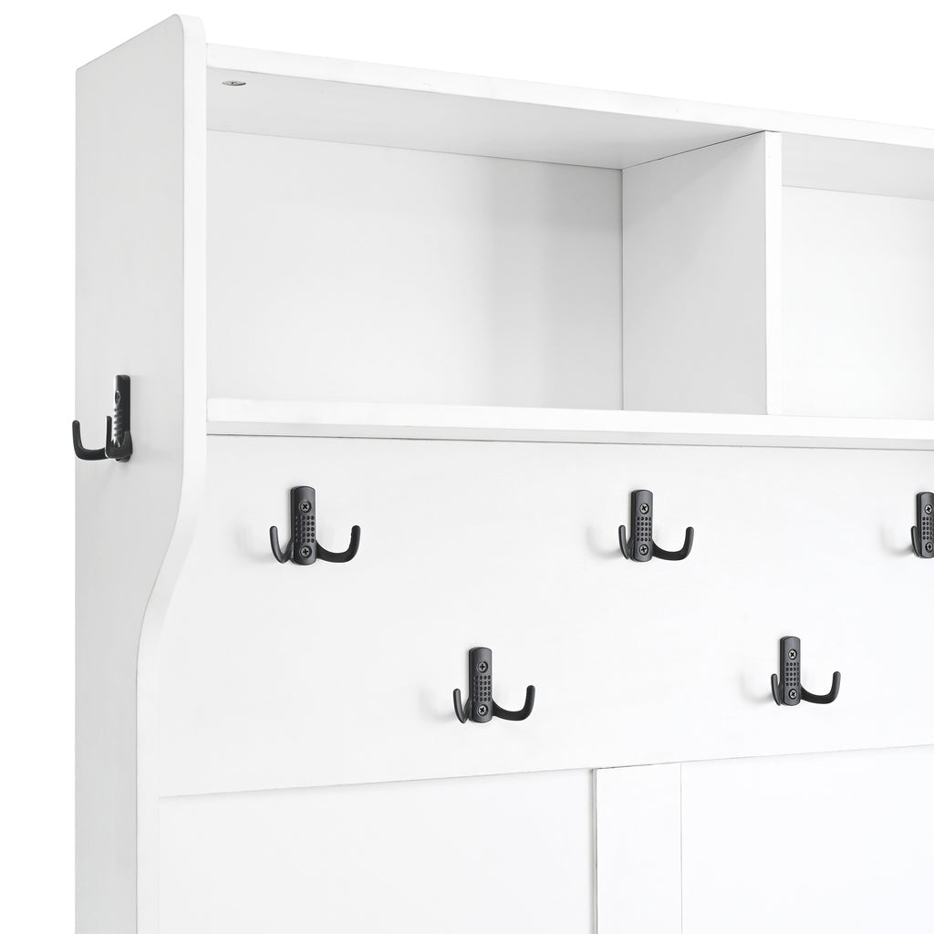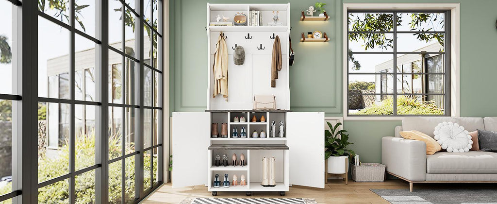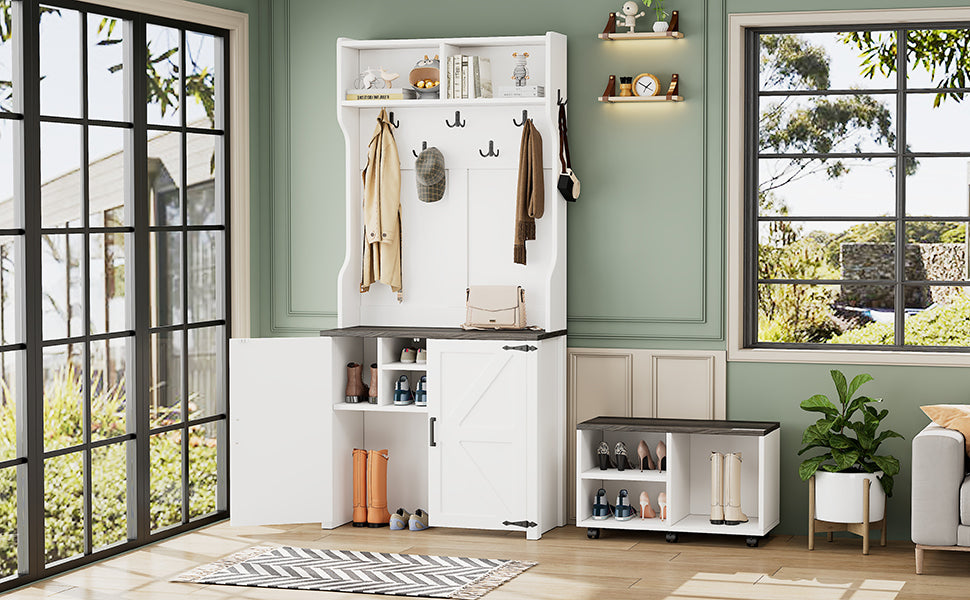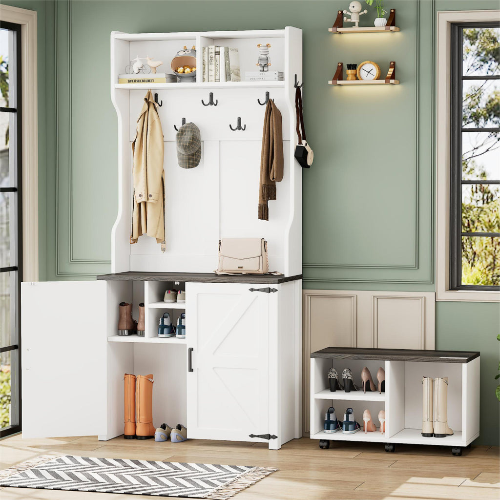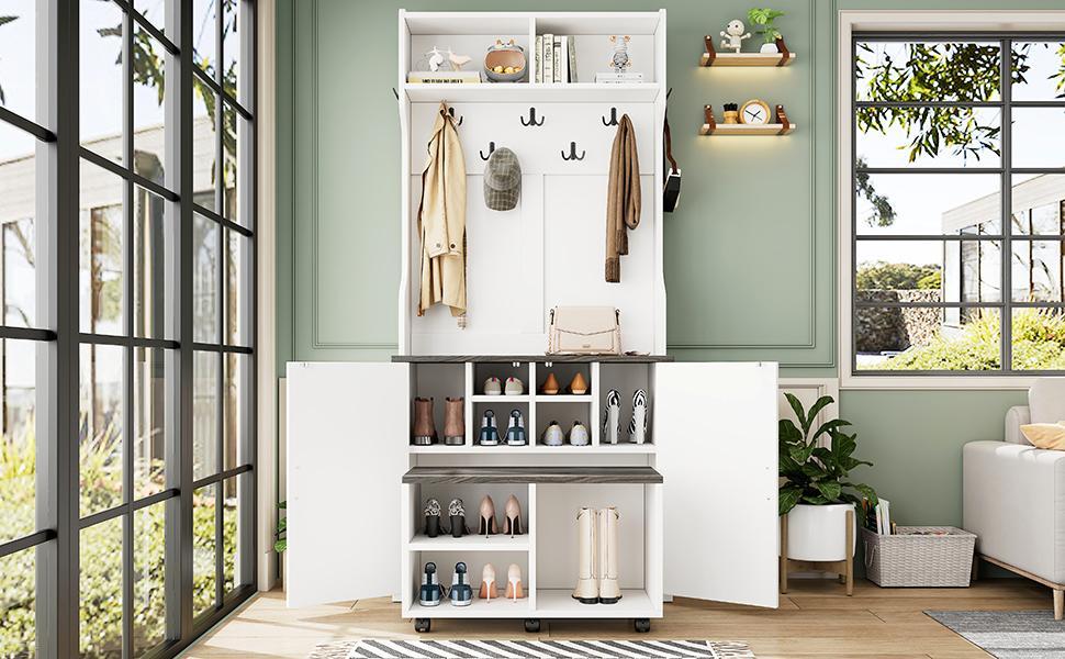 - Integrating coat rack, shoe cabinet, hanging hooks and seating bench, this hall tree offers a complete organization system for your entryway or hallway. No matter where it is placed, with this all-in-one furniture piece, you can meet a variety of storage needs in one compact design.