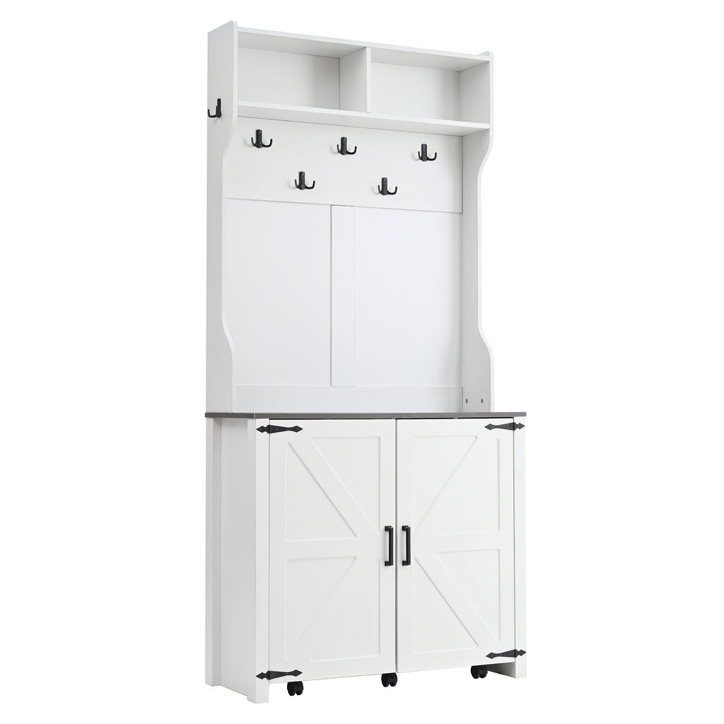 - Adorned with classic retro black handles, hinges and hooks, this hall tree exudes a rustic charm. The gracefully curved boards and two delicate barn doors further elevate the aesthetic of your hall tree, making it suitable to any farmhouse-inspired decor in your home.