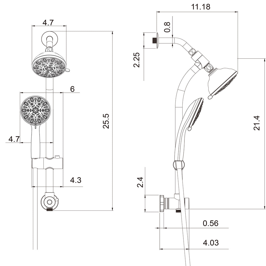 - What's included: 4.7-inch shower head and adjustable hand-held shower, 25.5-inch sliding adjustable rod, adjustable Angle shower holder, 59-inch stainless steel shower hose, stainless steel shower arm with enamel cover, gasket, plumber's tape, installation/operator's manual, etc.