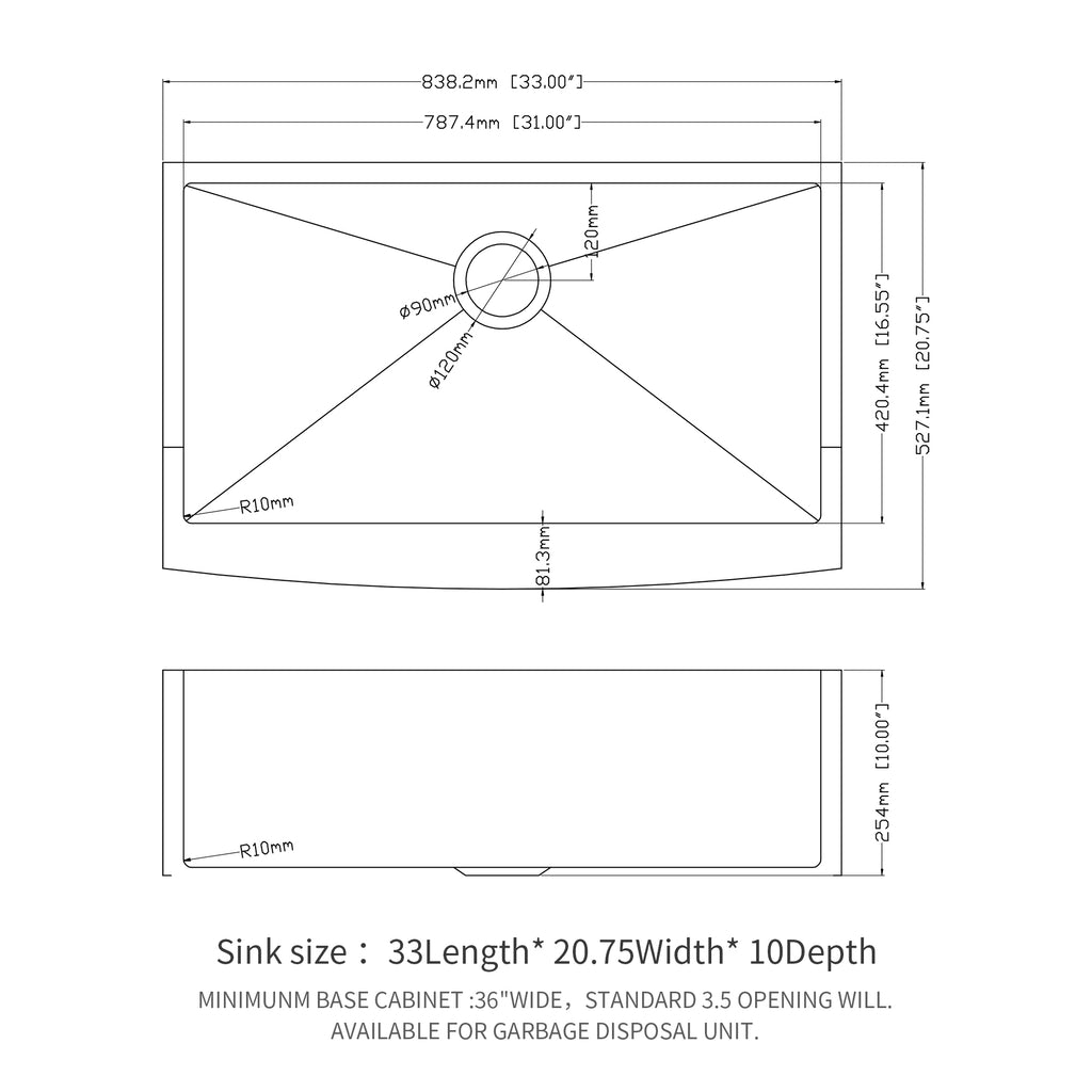 - [Dimensions] External Dimensions:33 x 21 x 10 inch, Internal dimensions: 31 x 16.55 inch. Minimum cabinet size is 36 inch. Standard 3.5' drain openings will fit any garbage disposal unit.