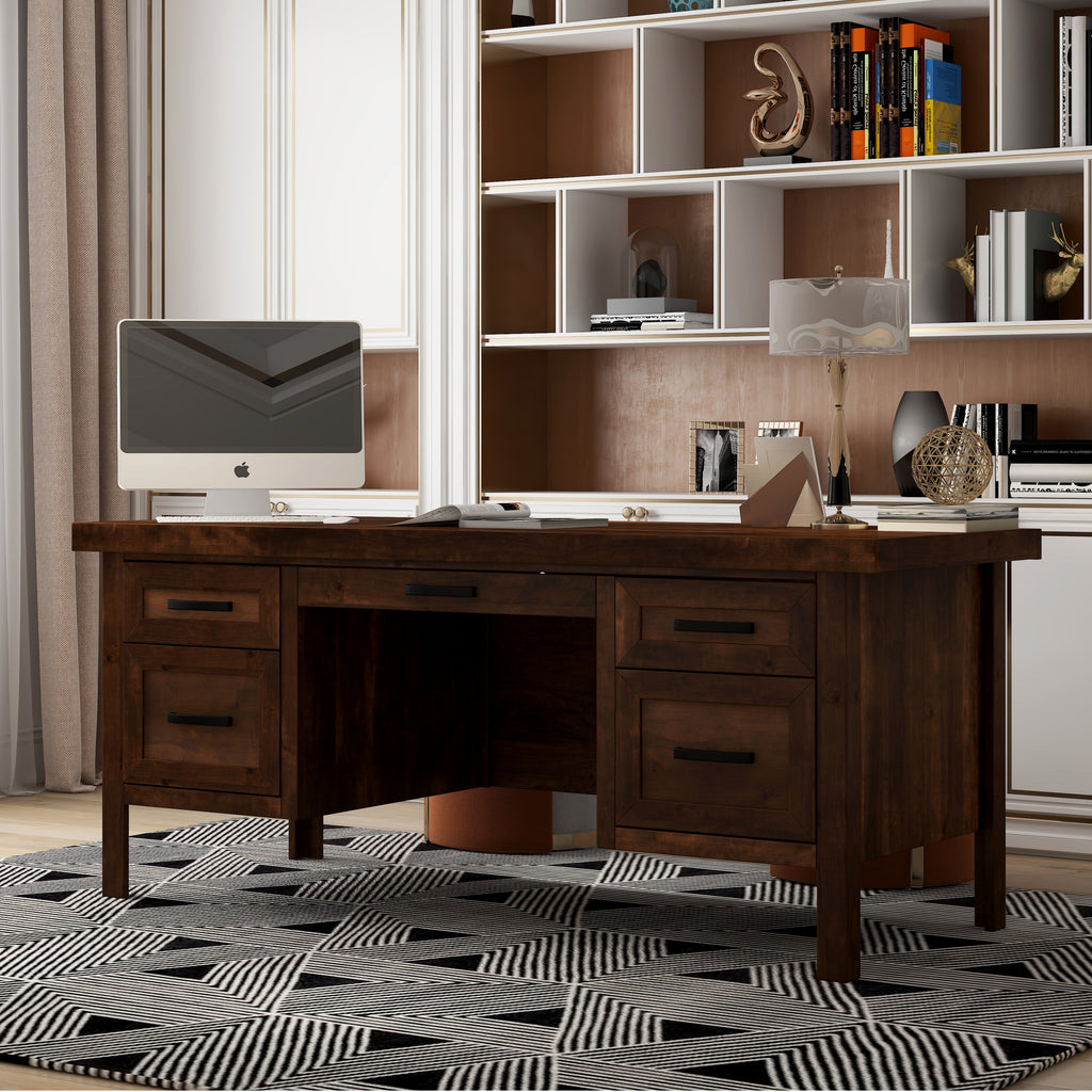 This 71 inch Executive Desk delivers a modern robust silhouette with a slightly rustic and urban feel. Skillfully crafted from Knotty Alder Solids and Veneers, this executive desk boasts intentional distressing, a rich Whiskey finish that enhances the natural wood grain and Flat Black hardware. Featuring one door, dropdown keyboard drawer, top drawer and hanging file drawer, your home office essentials will be organized and at your fingertips. Fully assembled upon arrival, this desk is ready to unbox and enjoy.