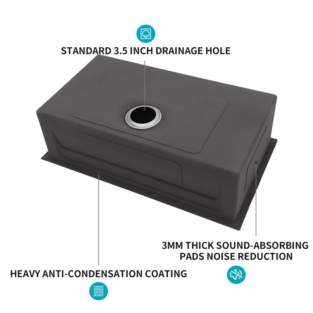 - [Coating and Silencer Pad] There is a thick coating on the outside of the sink to prevent condensation caused by weather changes. In addition, the 3mm thick rubber silencer pad can greatly reduce the noise from the faucet and give you a quieter cooking environment.