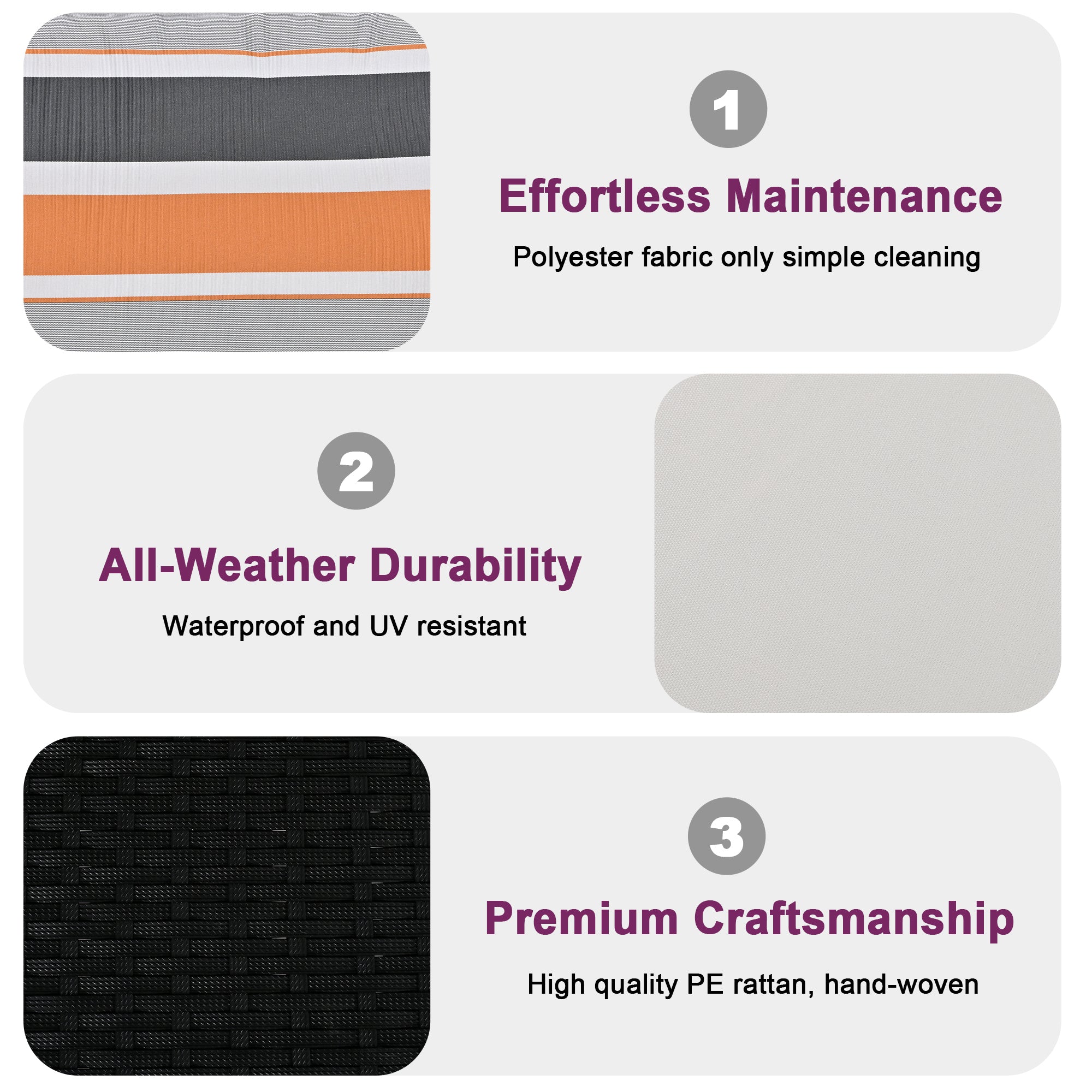 - Vibrant Pillows: Accompanied by a generously sized seat cushion and back cushion, this ensemble is further enhanced by the addition of two vibrant pillows. These colorful accents not only offer an extra layer of comfort but also allow for personalized placement – whether nestled at your side or gently propped behind – ensuring a truly indulgent relaxation experience.