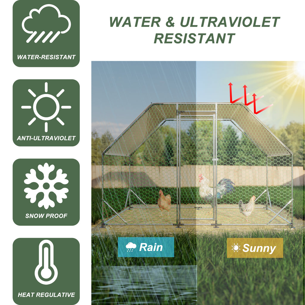 This heavy-duty chicken coop provides a large, comfortable, and safe space for your pets, whether they are chickens, ducks, rabbits or cats, dogs, or bamboo rats. Built with robust steel tubes, an extra thick tarp, and durable wire mesh, this chicken run is an ideal setting for raising animals all year round. The galvanized steel pipe used to construct the chicken cage greatly improves the rust resistance of the cage, giving it a longer life than other products. The walls of the chicken cage are made of PVC-coated hexagonal metal mesh, which is strong and durable, and not easily damaged. The chicken coop tarp is removable, so you can have the option of letting the animals enjoy the warmth of the sun as well as avoiding rain, snow, and excessive UV rays. Don't hesitate, this sturdy and durable chicken cage will become your animals' new favorite place!