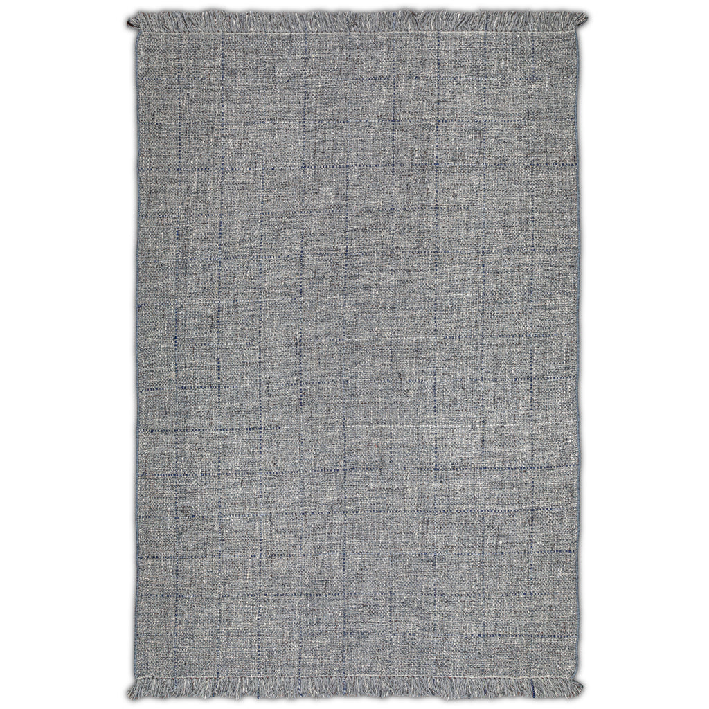 - Detailed with a woven pattern in grey and blue featuring a hand-knotted fringe