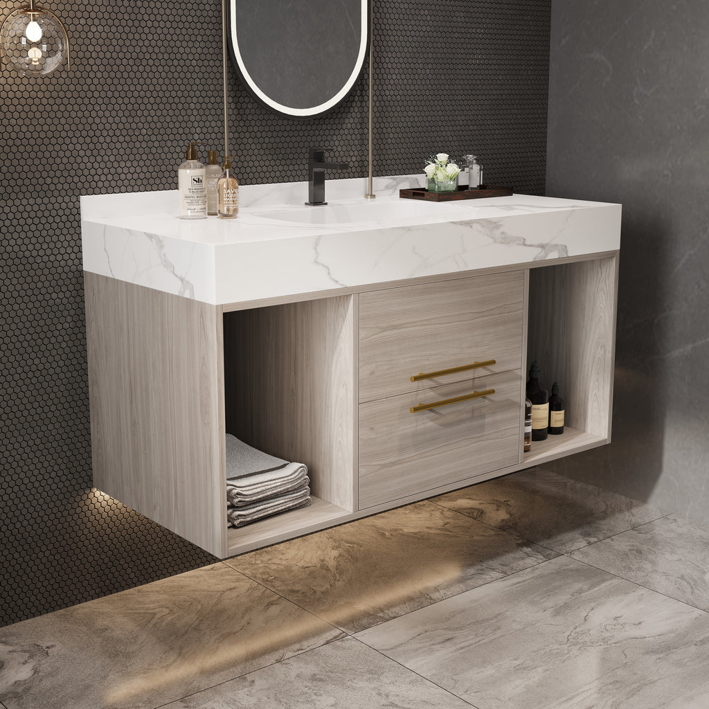 - Atmospheric gold decoration: Atmospheric gold handles decorate the cabinet, enhancing the overall beauty of the vanity with a comfortable touch.