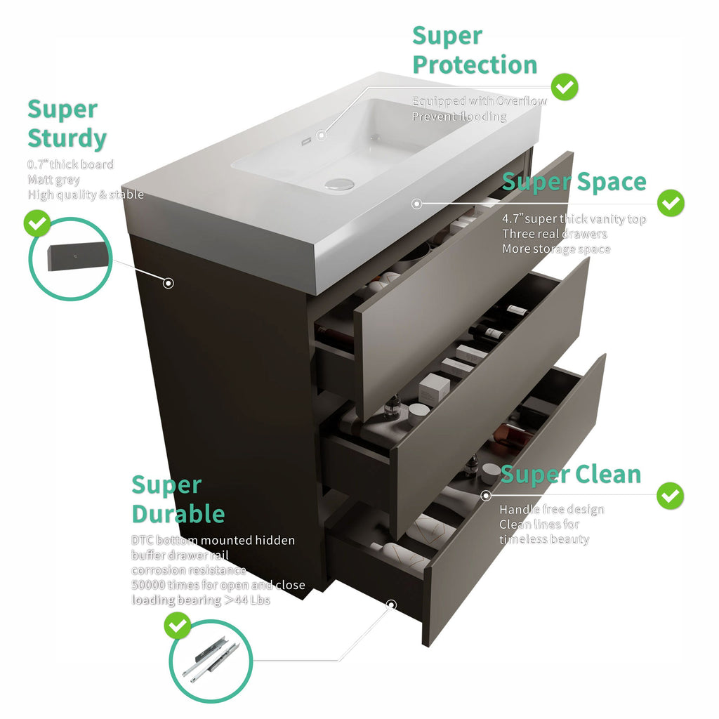 Step into a world of contemporary sophistication with Alice, the single freestanding bathroom vanity that will transform your bathroom into a luxurious oasis. With its sleek gray finish and glossy white engineered stone basin, Alice exudes a timeless charm that effortlessly blends style and functionality.