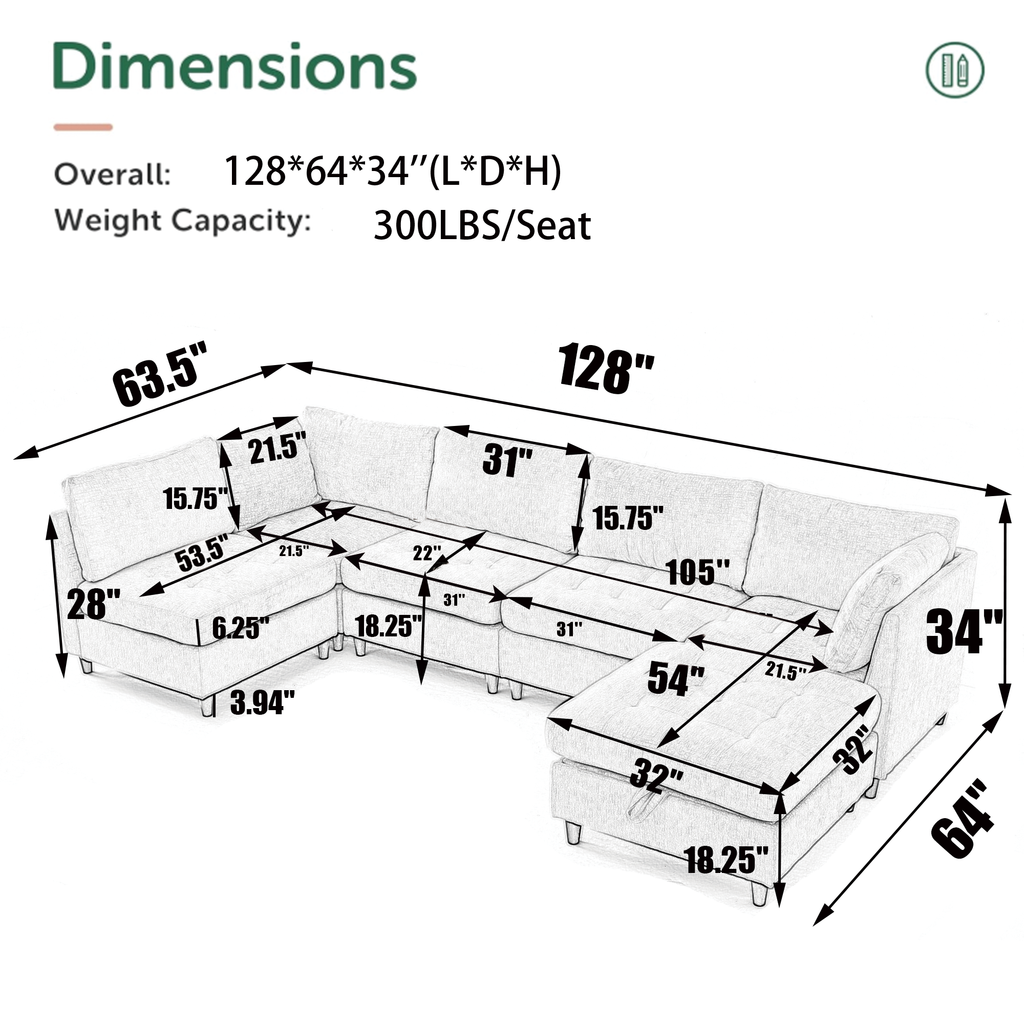 - 【Spacious and Cozy】Sofa size: 128' D x 64' W x 34' H. Weight Capacity: 300 lbs / Seat. This roomy modular sectional sofa is tailored for larger individuals, featuring wider seats that ensure extra comfort. Whether you're binge-watching your favorite shows, diving into a good book, or enjoying conversations with loved ones, its generous design provides plenty of space for relaxation and leisure.