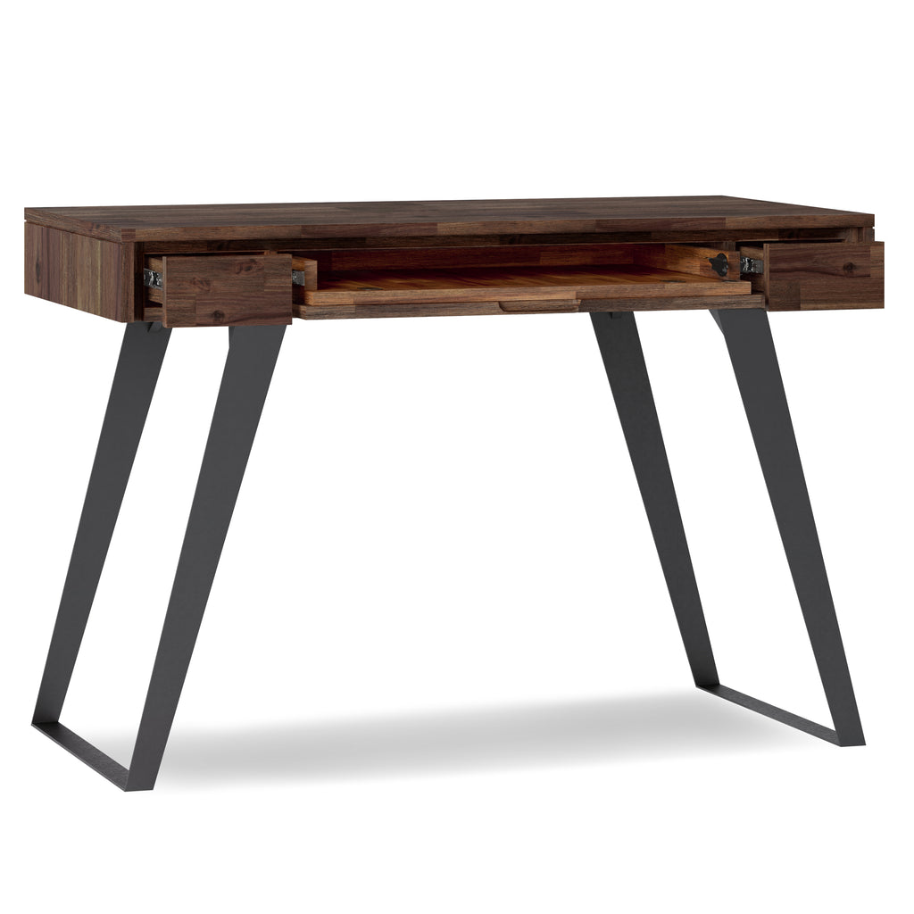 - Modern, industrial design includes discreet hand pulls on drawers and solid metal angled legs for reliable support