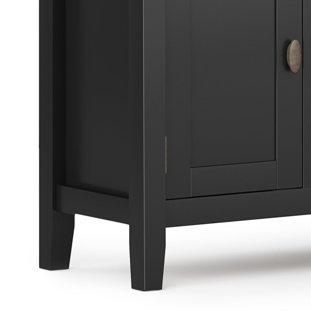 - Features a large centrally located open area with two open spaces, two (2) drawers as well as two (2) framed doors with enclosed spaces; the two (2) large side storage cabinets open to one (1) adjustable shelf each.