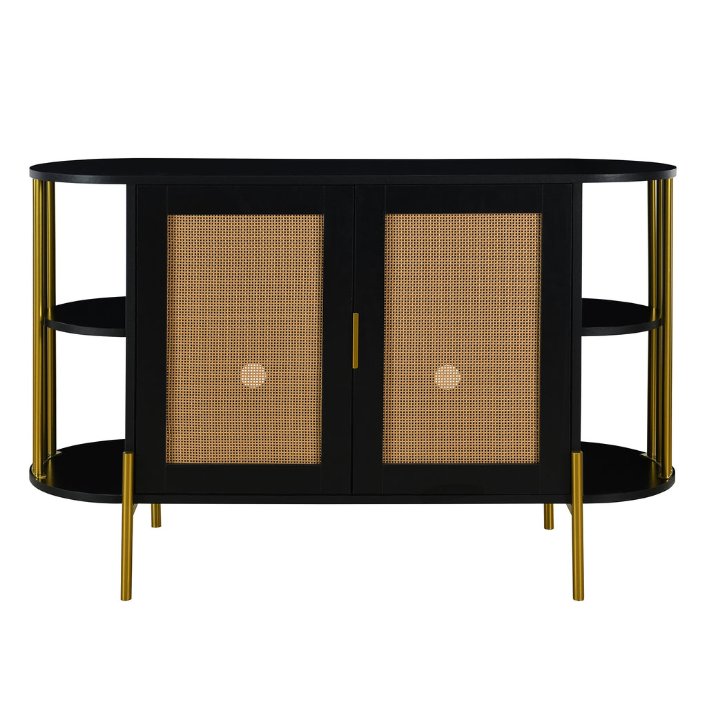 - High-Quality Material: Crafted from premium particleboard, It ensures sturdiness. The two doors feature finely crafted rattan, guaranteeing long-lasting use. The gold handles, legs, and side supports are all power coating, resulting in a smooth surface that not only adds a touch of luxury but also enhances durability and stability. The interior includes an adjustable shelf to meet storage need. Tabletop weight capacity: 331 lbs; Shelves weight capacity: 110 lbs.
