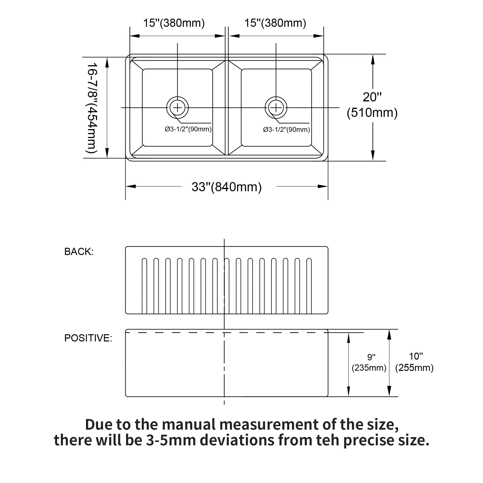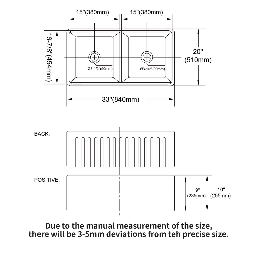 - Stylish Deep White Kitchen Sink Size: Exterior-33x20x10'. Large double bowl kitchen sink has exactly an appropriate size to fit into more cabinets. With enough depth to hold and clean pans, pots and grills without splashing around, this deep kitchen sink helps you tackle more housework at once.