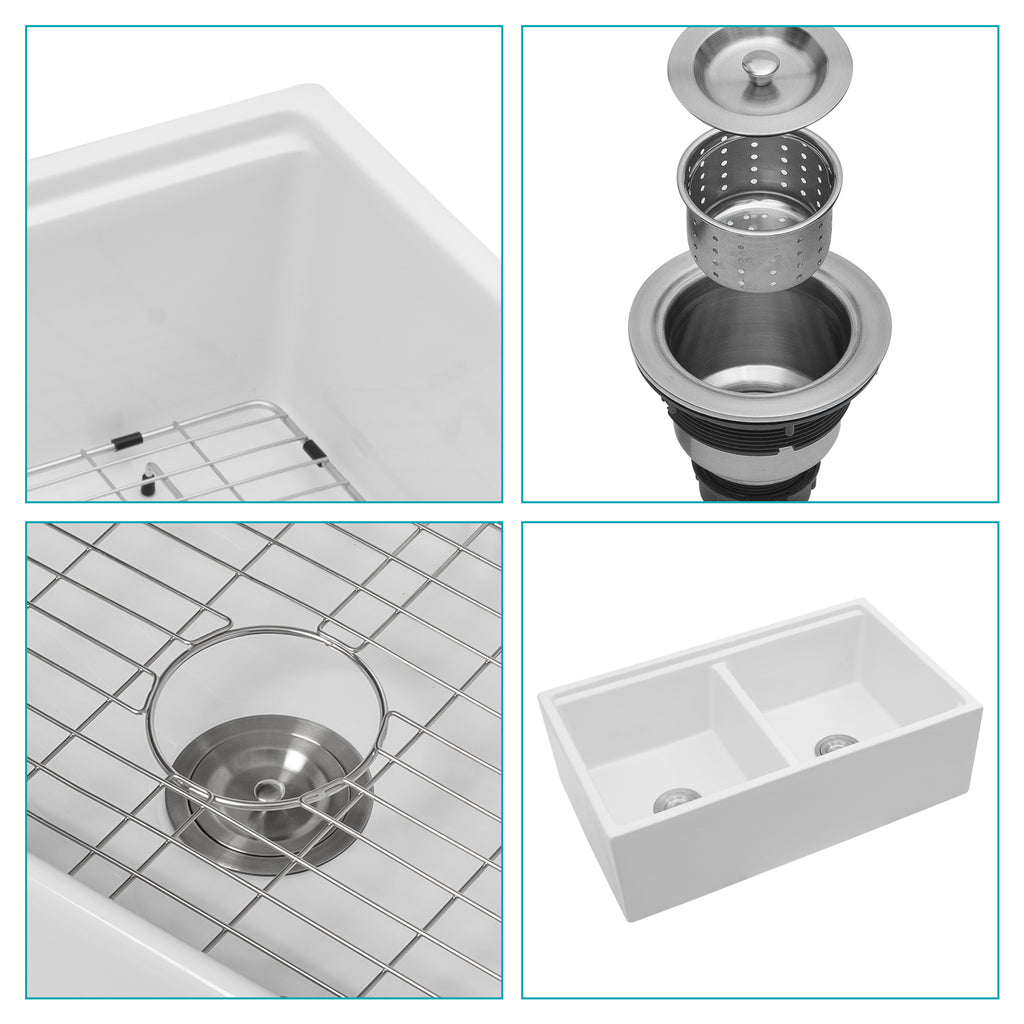 - This 33 inch white farmhouse kitchen sink constructed of ceramic for extreme strength and durability. Kitchen Sink surface is extreme resistance to chips, abrasion or scratches and discoloration for years of beauty and reliable performance.