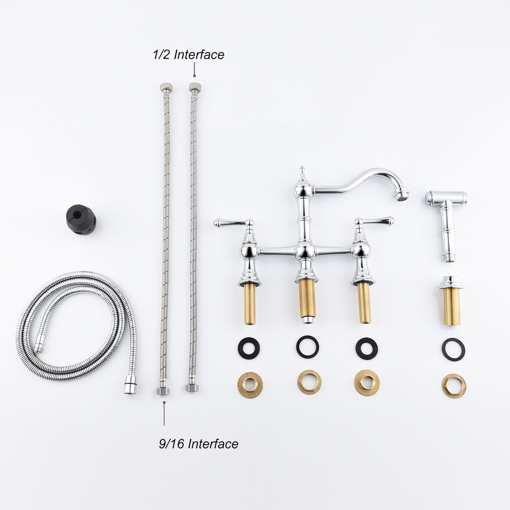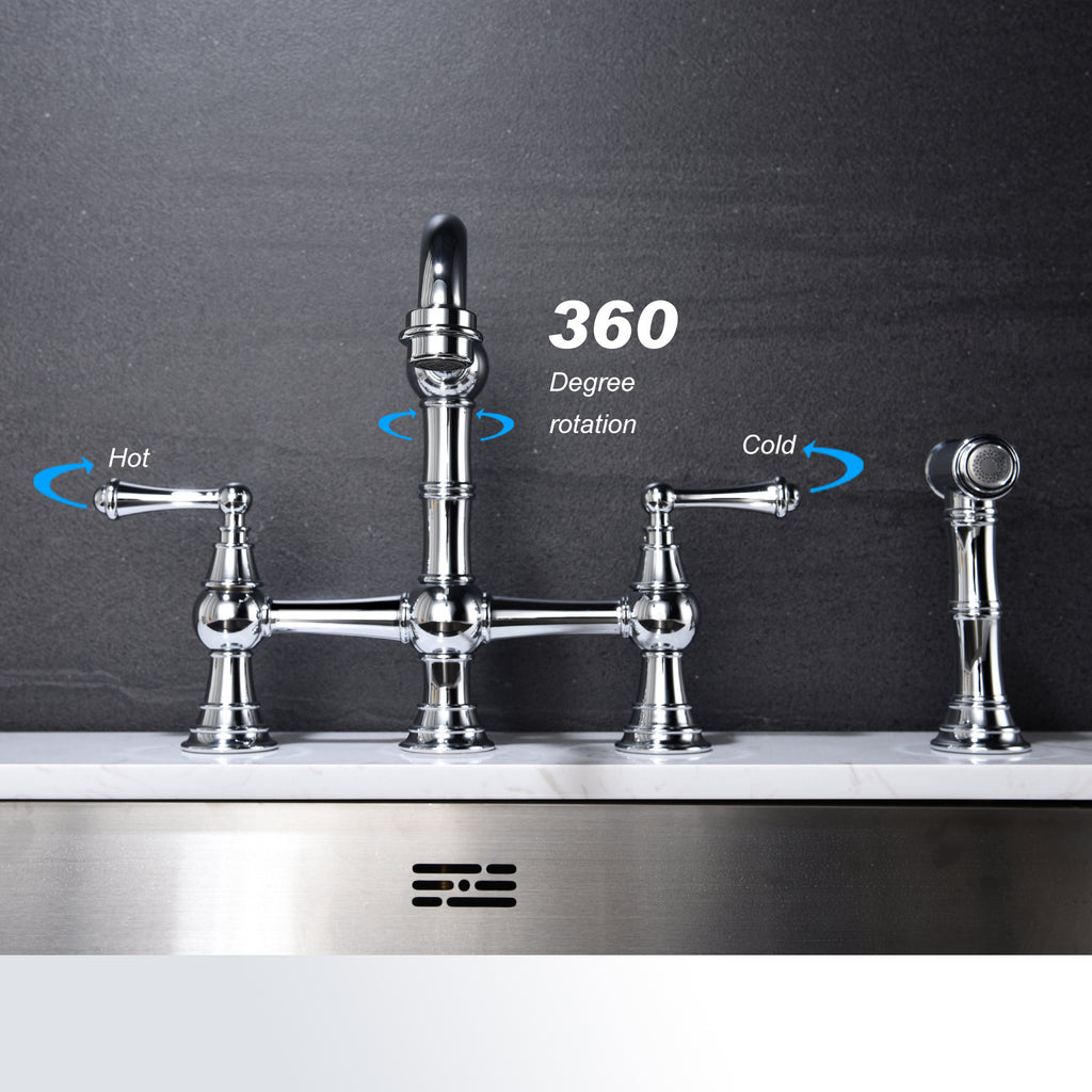 - Bridge kitchen faucet features a dual handle design that allows you to easily and precisely control the water volume and temperature.