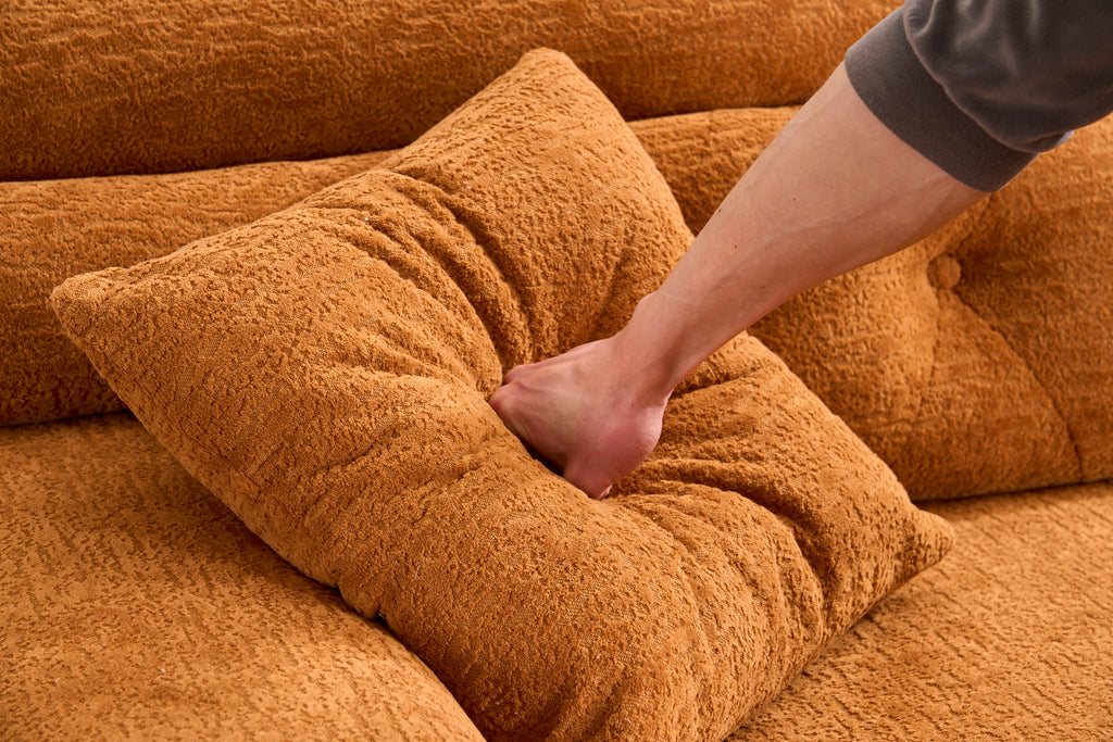 - Compression Sofa with wider armrests, deeper seat depth, and raised backrest provide a more comfortable seating experience. The 2 small pillows included for free can be cradled in your arms or leaned against your back, allowing you and your family to relax even more. The super wide sofa gives every part of your body plenty of space to relax.