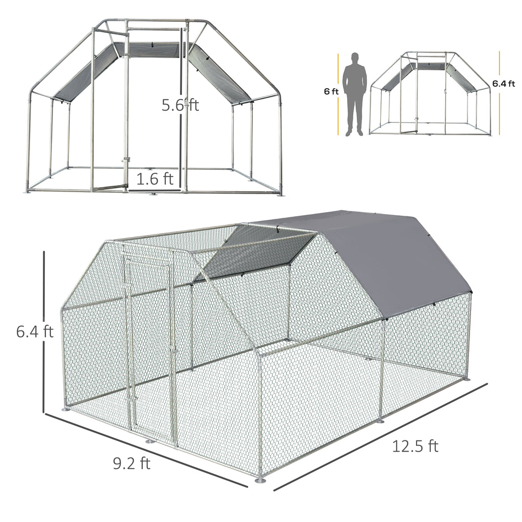 - Chicken Coop Info: Overall Dimensions: 12' L x 9 ' W x 6.5' H. The diameter of galvanized steel pipe: 1.26'. Assembly required.
