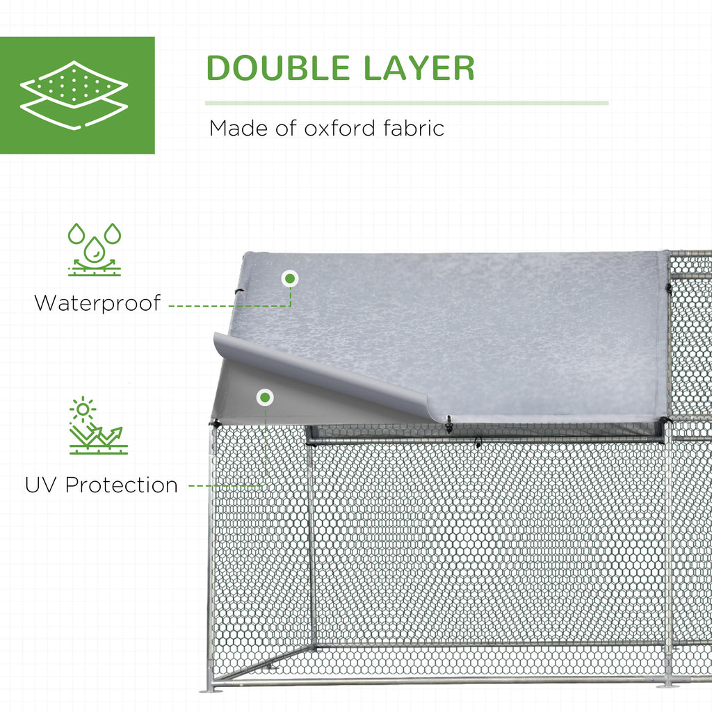 - Shady Roof: The shady roof with spring button clips helps your pet stay cool in the heat while avoiding dehydration and keeping them comfortable. The coverage of this chicken cage also protects them in case of rain showers. It's made from specially treated Oxford cloth with water and UV resistance for survivability in bad weather. Offer your small pet a homier space with a place to stay roofed.