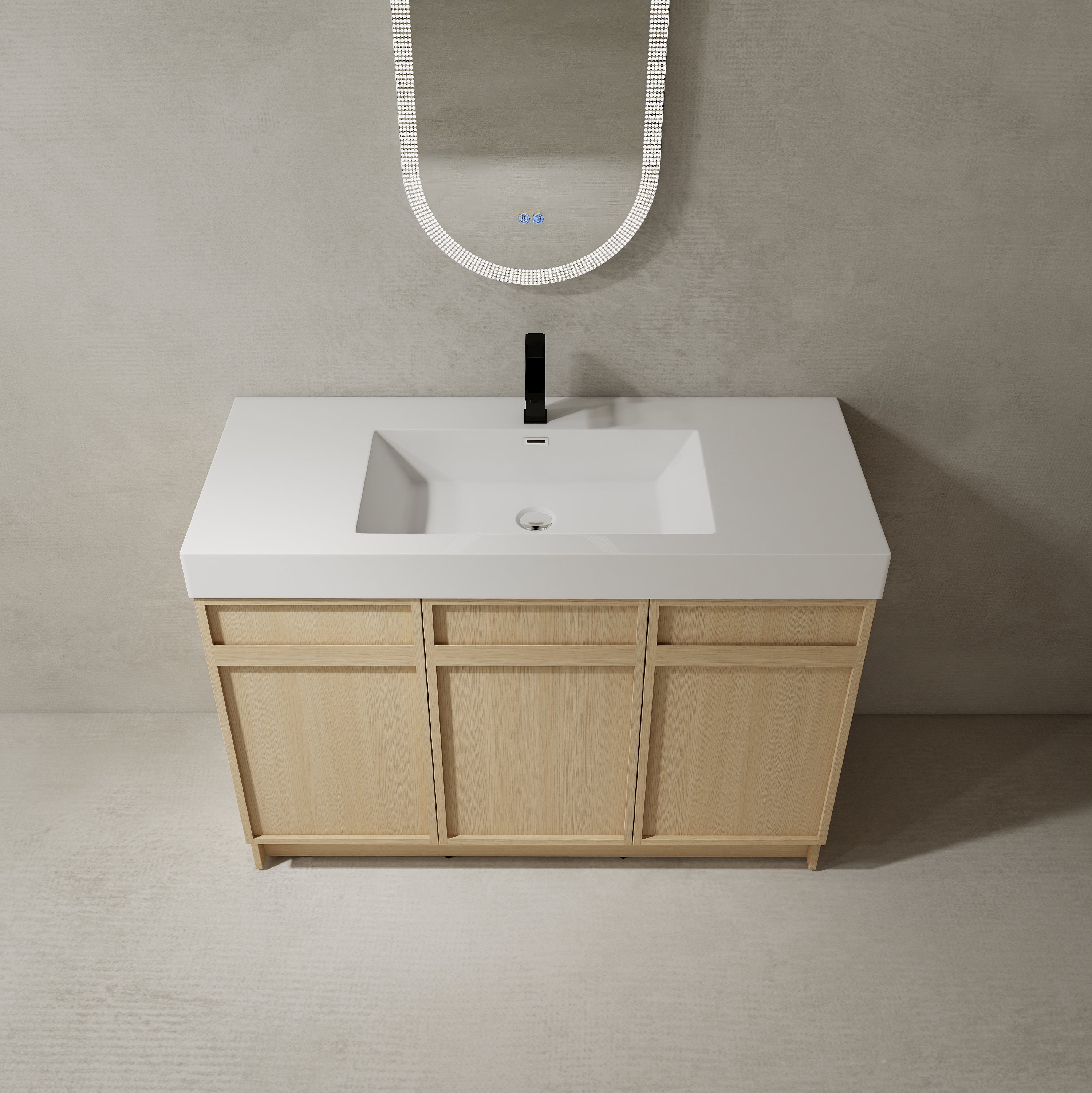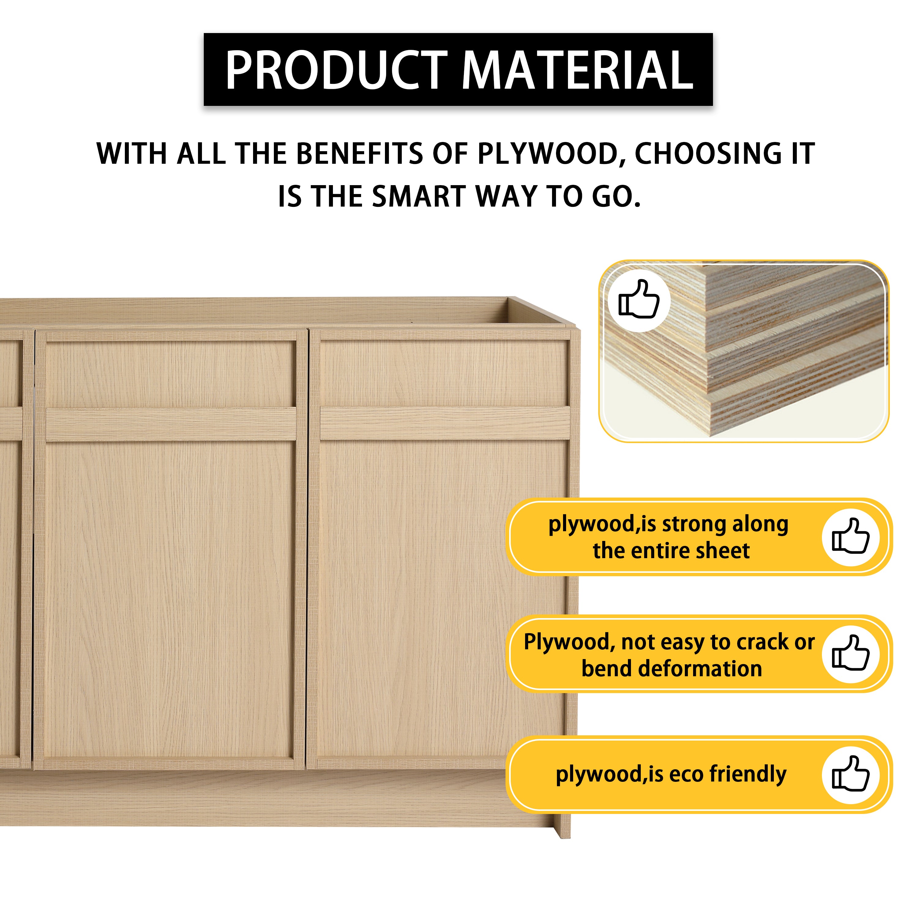Vanity Base is made of high quality plywood that surface material used 'Scratch & Water-Resistant' melamine, which is designed to not only withstand threats of moisture and humidity but also easy to clean and maintain.