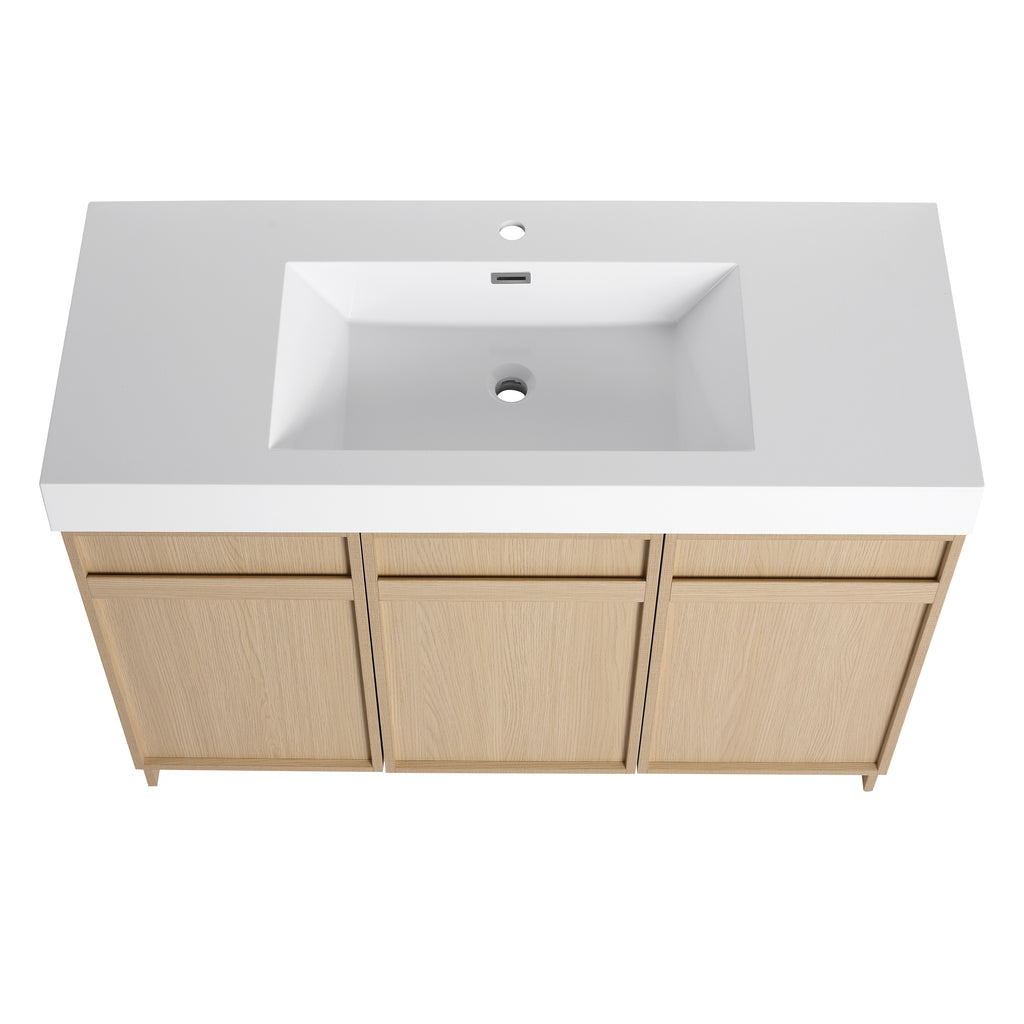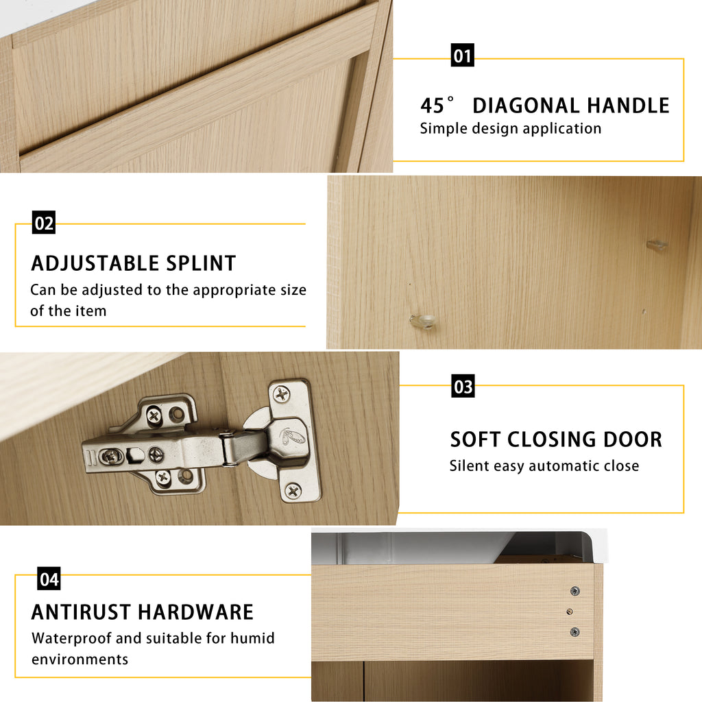 Our design is derived from life, close to reality, has a bright modern style, and is ergonomic. The bathroom cabinet and basin integral design make the product more concise and easy. The bathroom cabinet has its own adjustable shelves inside, providing a lot of extra space for the bathroom.