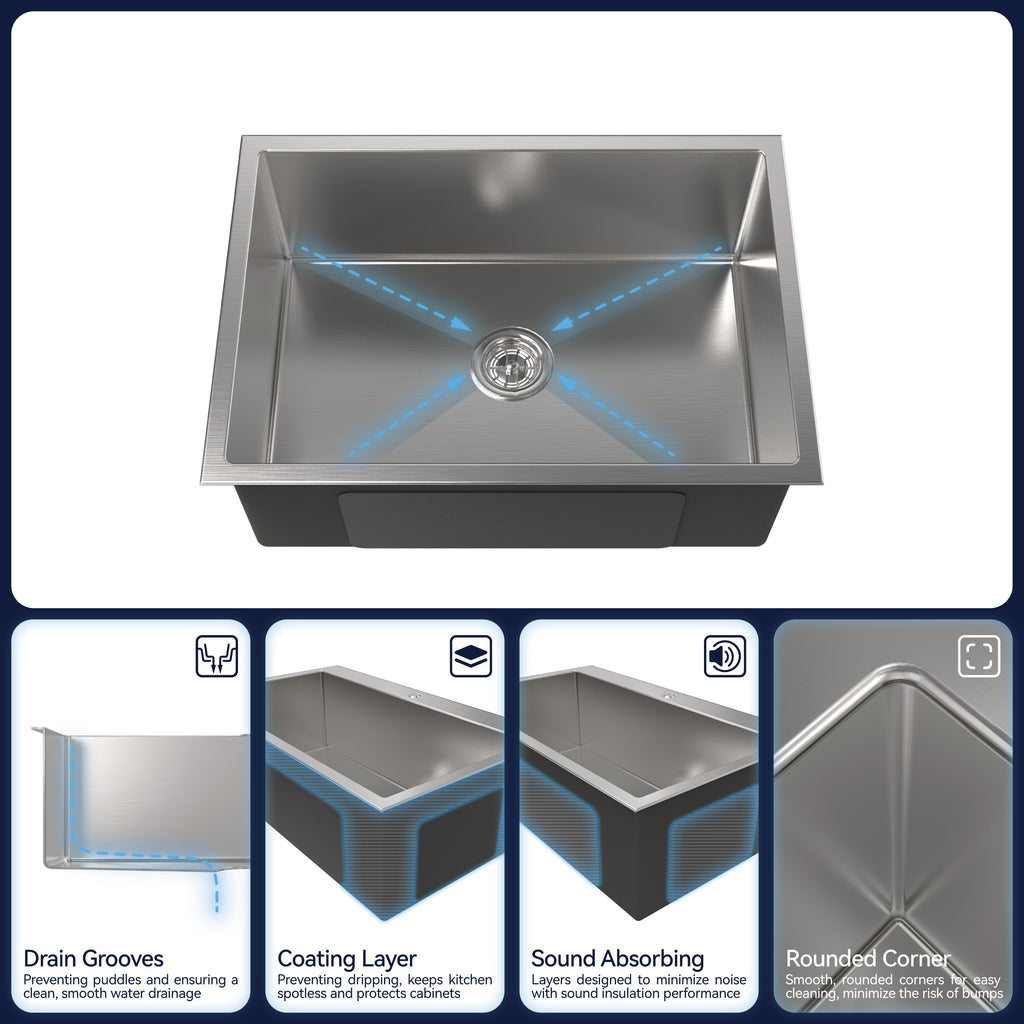 - PRACTICAL PERFORMANCE: R10 radius rounded corners for easy wiping of sinks; Anti-condensation coating reduces condensation and prevents moisture buildup; Thick silicone pads reduce noise and sound; The openable lid at the top of the pipe stops food debris from clogging the pipe opening. For everyday meal preparation or hosting a great party, this kitchen sink is a functional, intelligent kitchen must-have.