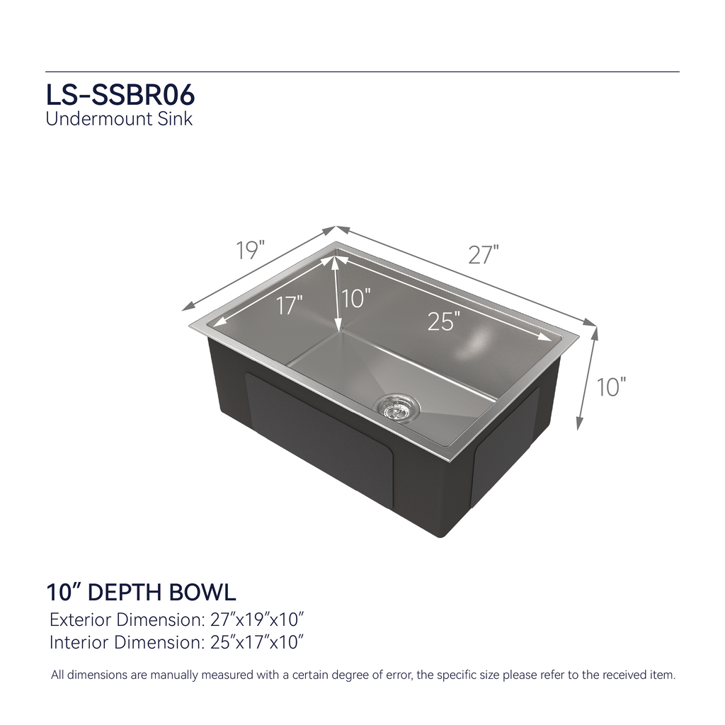 - 27 INCH WORKSTATION KITCHEN SINK: 27' (wide) x 19' (length) x 10' (depth). The drop-in kitchen sink's exterior design ensures a modern and elegant aesthetic while maximizing the available space to accommodate large dishes pots and pans.