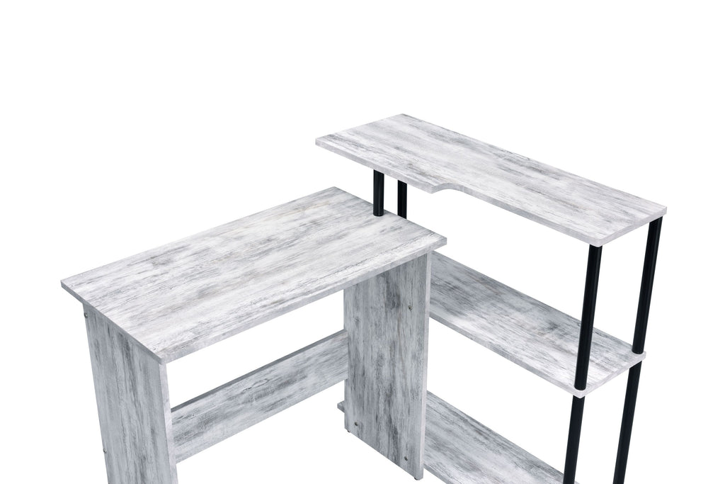 - This L-shaped writing desk is available in three distinct finishes: Weathered Oak & Black, Antique White & Black, and solid Black, catering to various decor preferences.