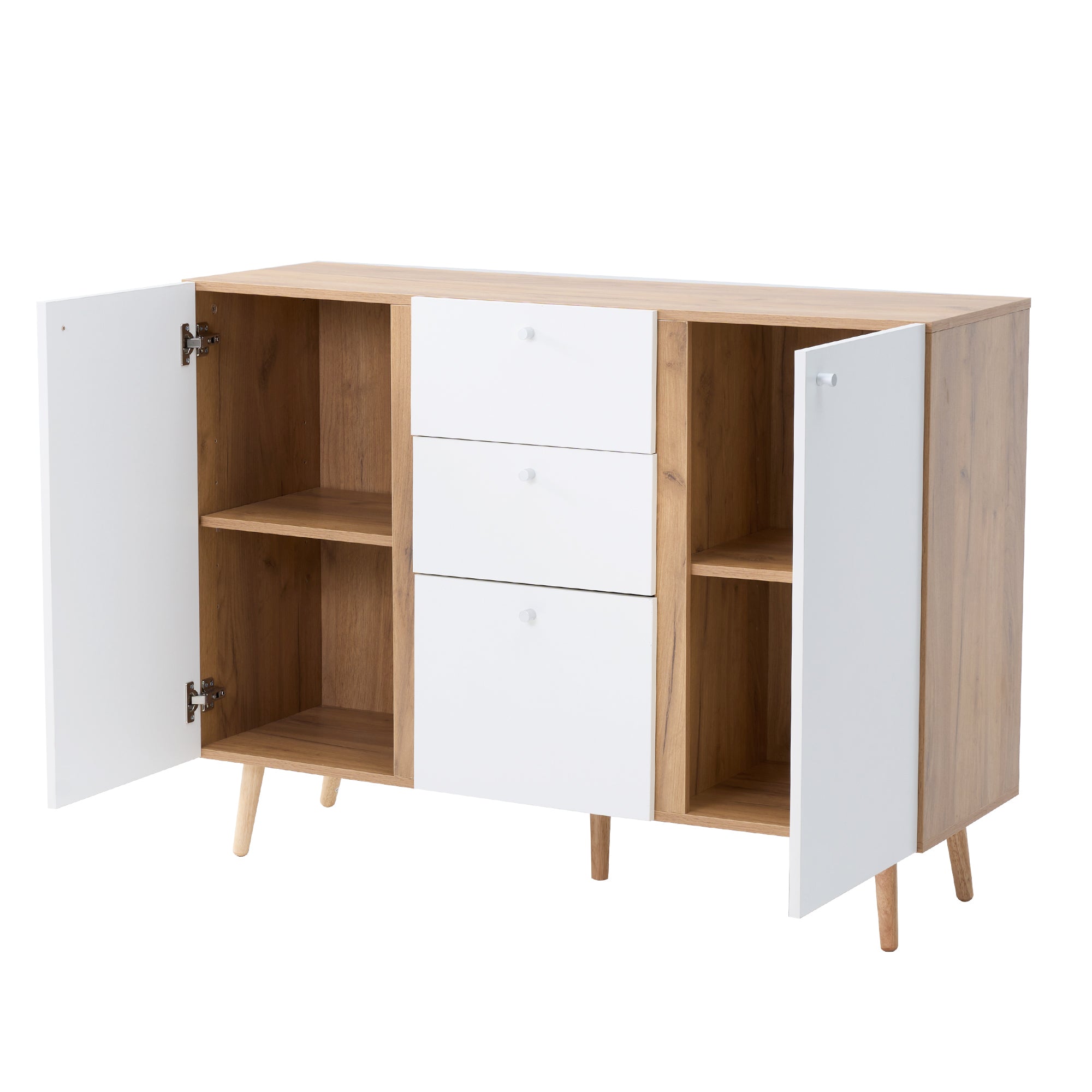 - This sideboard cabinet features 2 tiers shelf behind each door, to store all your dinning ware, tableware, books or media accessories. Full sized drawers are roomy to store infrequently used items out of sight