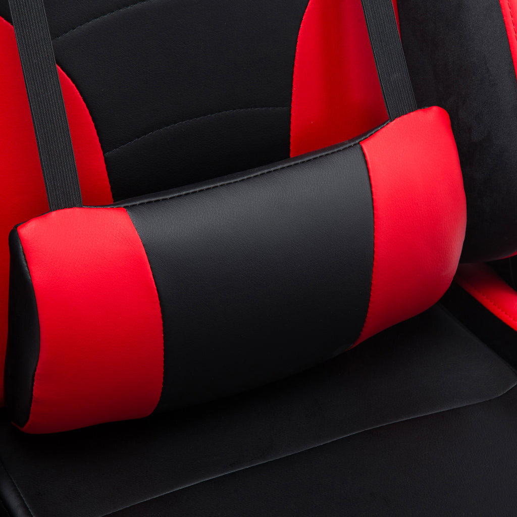 Add a classy touch to your gaming station with our red/black gaming chair. It is sturdy and comfortable, has durable nylon base and is well cushioned to support your back. This high back chair comes in two tone with velvet accents, outlining the curves of the chair. Made with rich and durable PU, contoured segment memory-foam padding, includes neck and lumbar support pillows, adjustable 2D padded armrests and the pneumatic seat height adjustments make its look complete. Features tilt with tension control and 150 degree reclining mechanism and a 5-star durable nylon base with non-marking casters allows you to glide with ease. This chair supports 250lbs of weight limit.