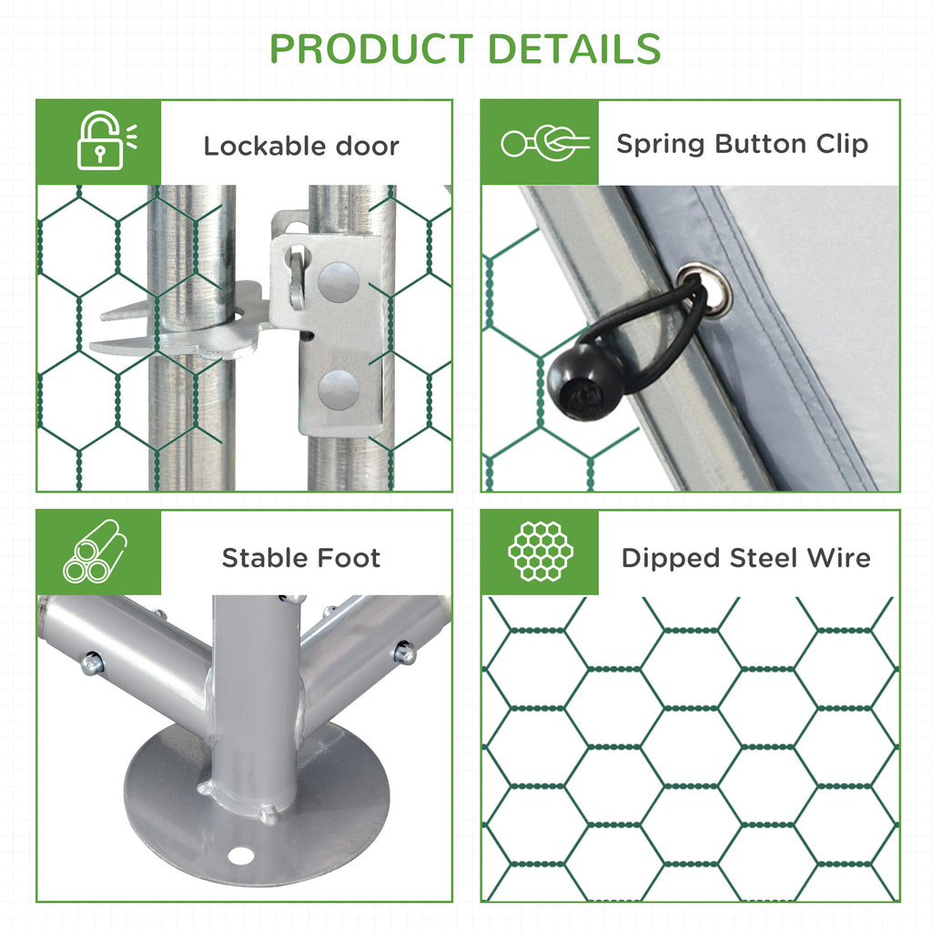 - Safety Design: A lockable door with a latch makes this large chicken coop more safe. The chain link walling features hexagonal mesh wires with a galvanizing technology that's resistant to wear and rust. The metal wire is treated with a dipping process that ensures protection against injury.