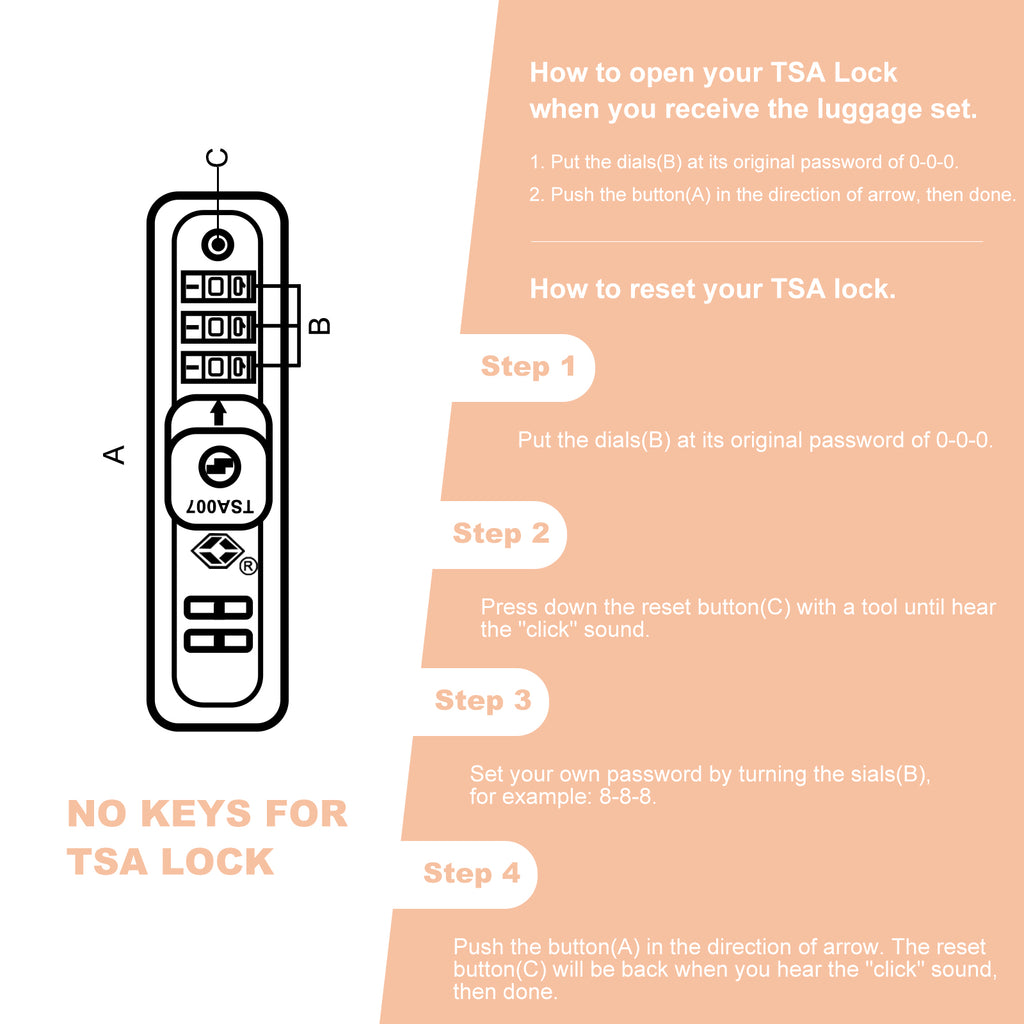 - TSA lock allows only customs agents to inspect your luggage without damaging the lock when traveling and protects your stuffs in luggage and privacy more better. Simply set the combination. No keys are required.