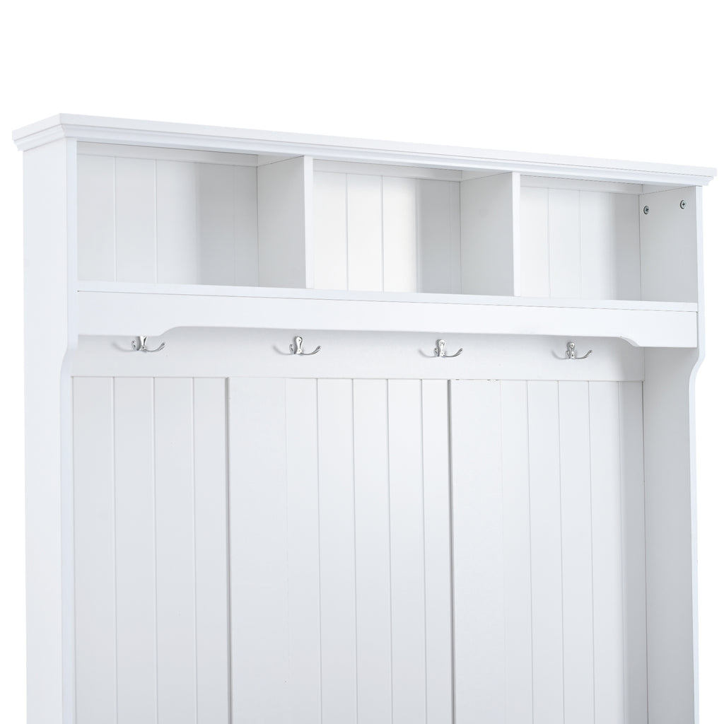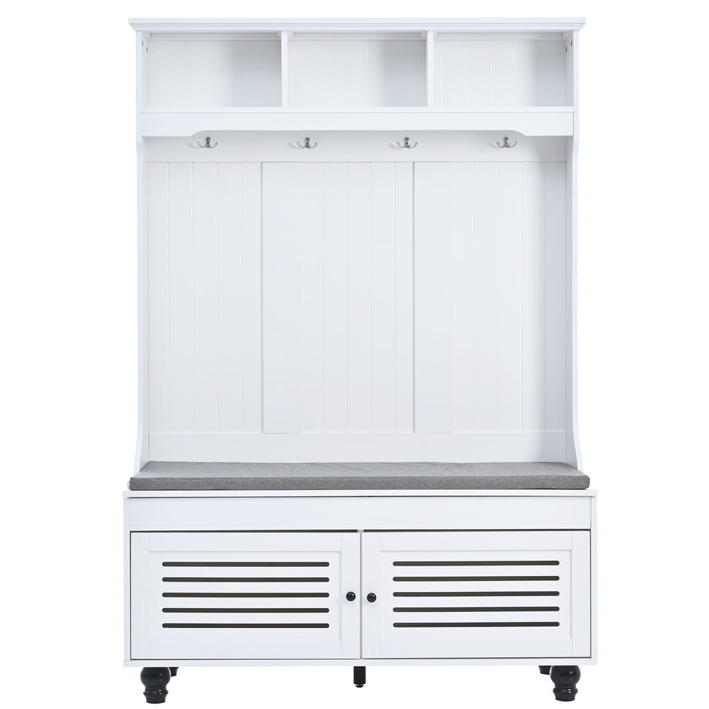 For a beautiful and properly organized foyer, entryway or mudroom, nothing beats the effectiveness of this beautiful multifunctional hall tree with storage bench. It's shutter-shaped doors and clean finish provides the casual elegance that's great for any home decor style. Constructed of high-quality MDF and particle board. Showcasing classic three storage cubbies at the top can organize smaller items or showcase decor. Place blankets and magazines under the seat, and shoes, storage baskets, or extra items can be stored in the bottom cabinet, while hanging coats, hats, and scarves on the four double prong hooks.