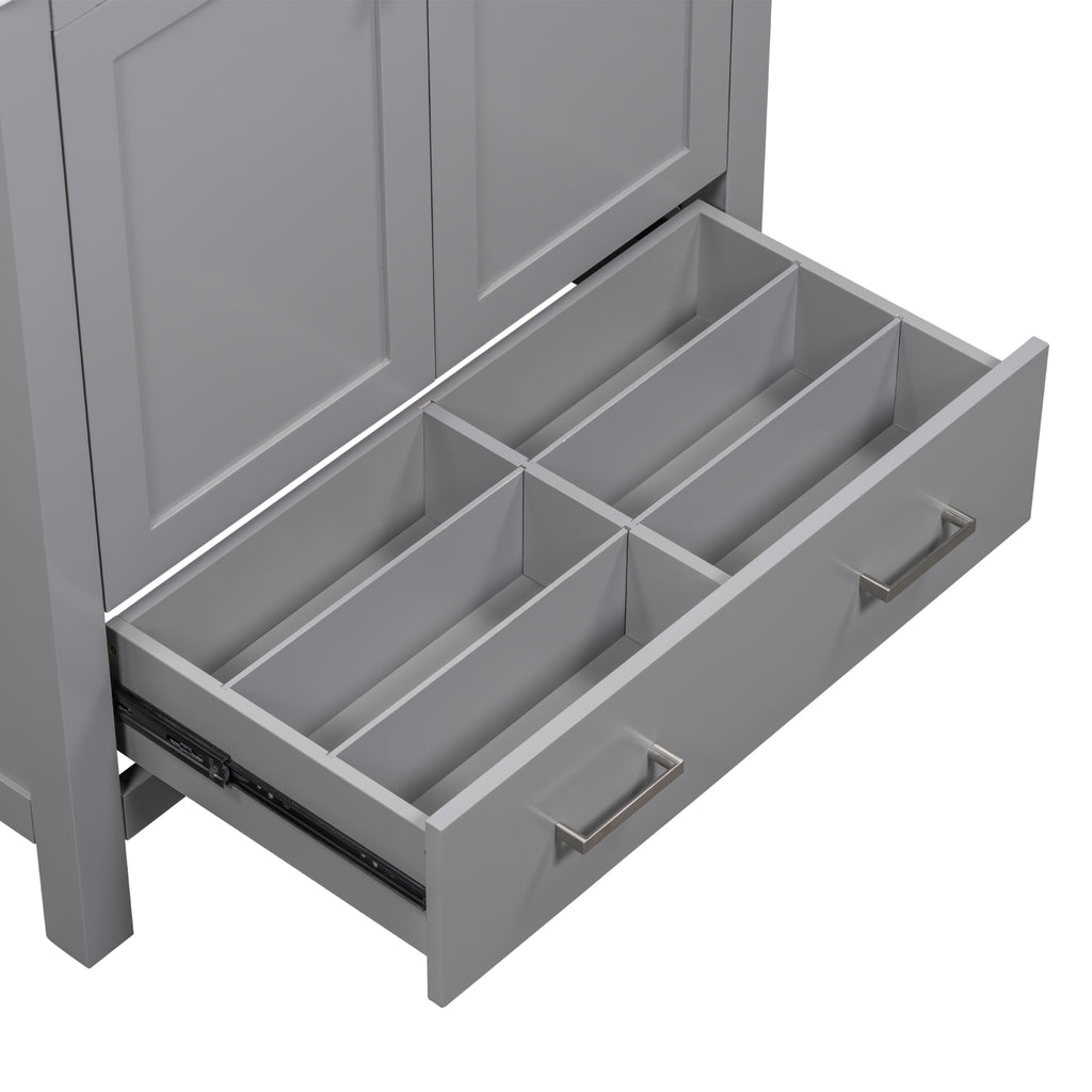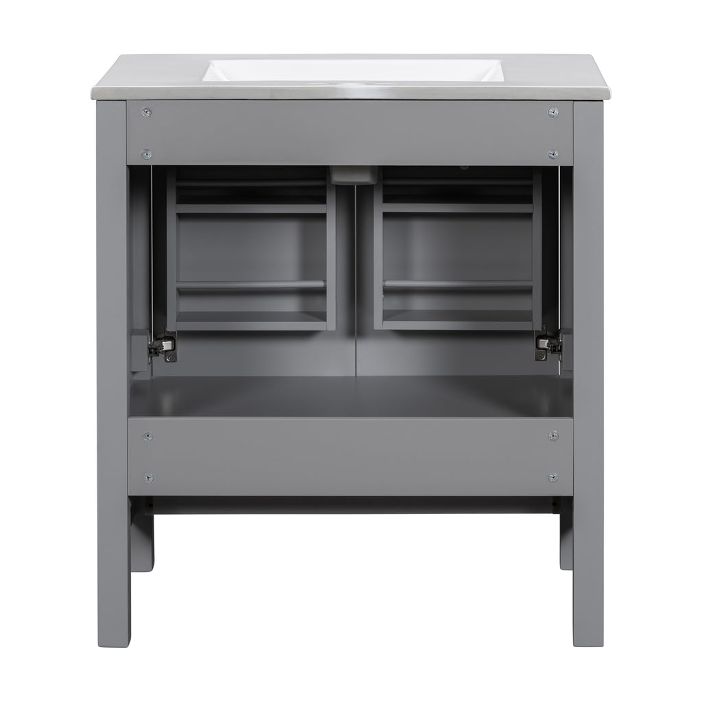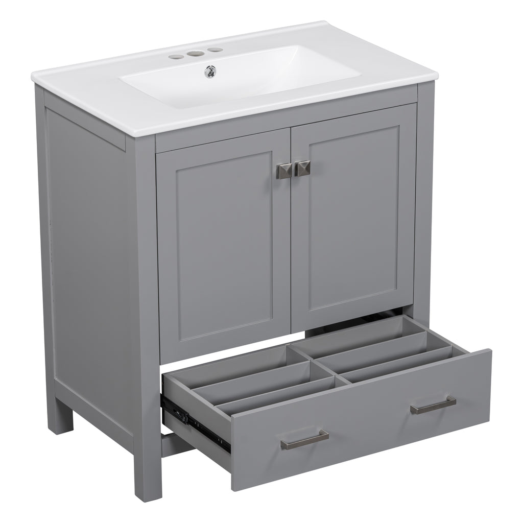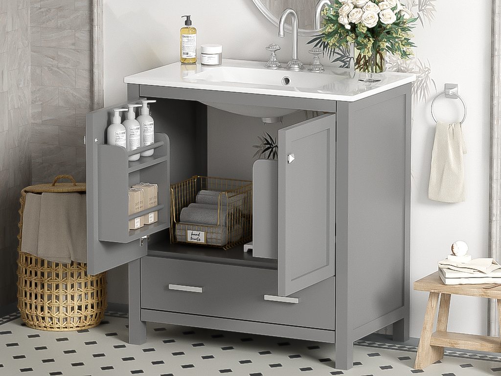- [Elegant and Stylish Appearance] Our 30-inch Bathroom Cabinet features sleek lines and a modern design. With its sophisticated gray exterior, fashionable handles, and a white sink, it adds a touch of brilliance to your bathroom decor. The combination of style and functionality creates an inviting and aesthetically pleasing ambiance.