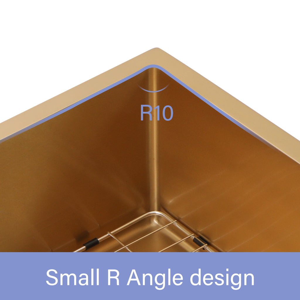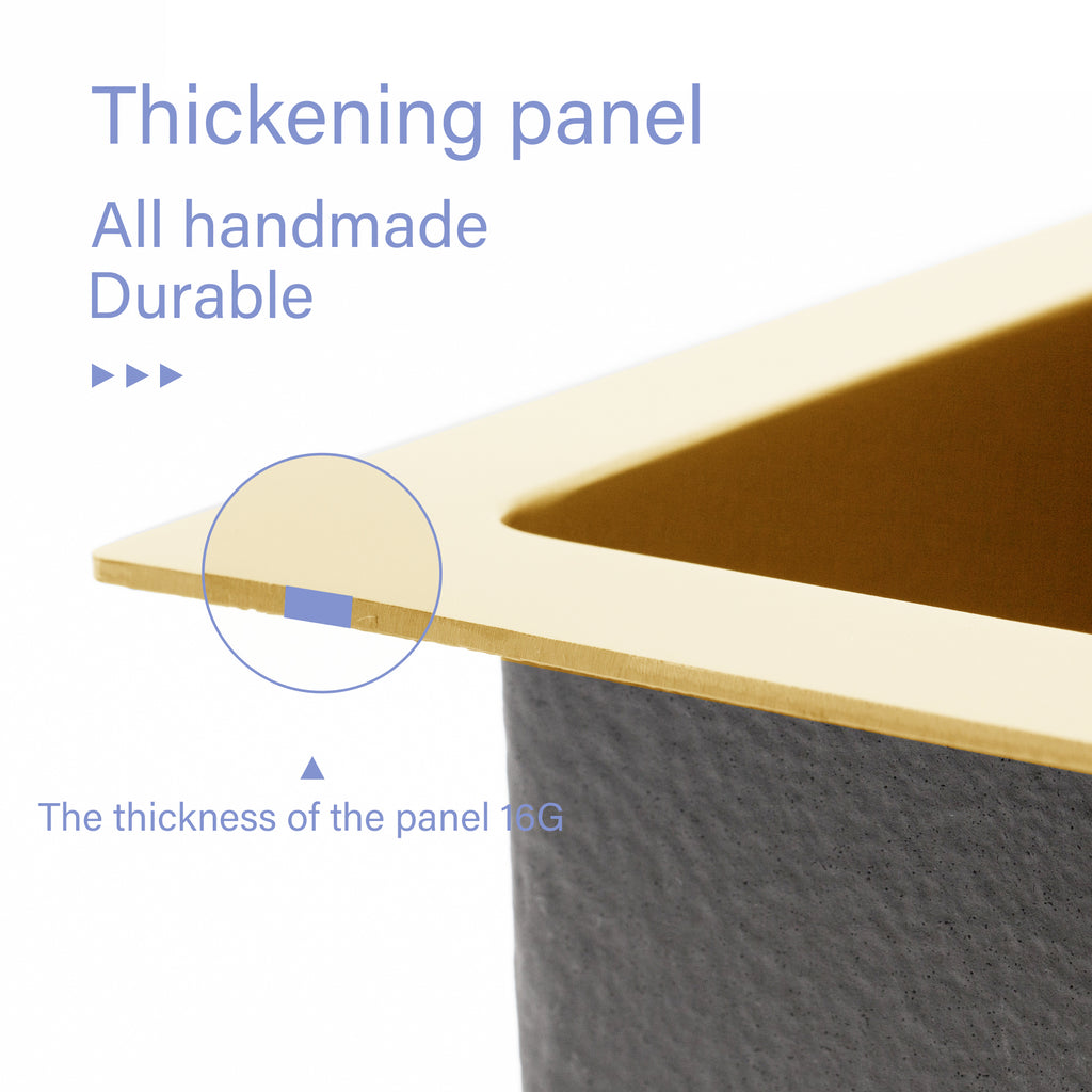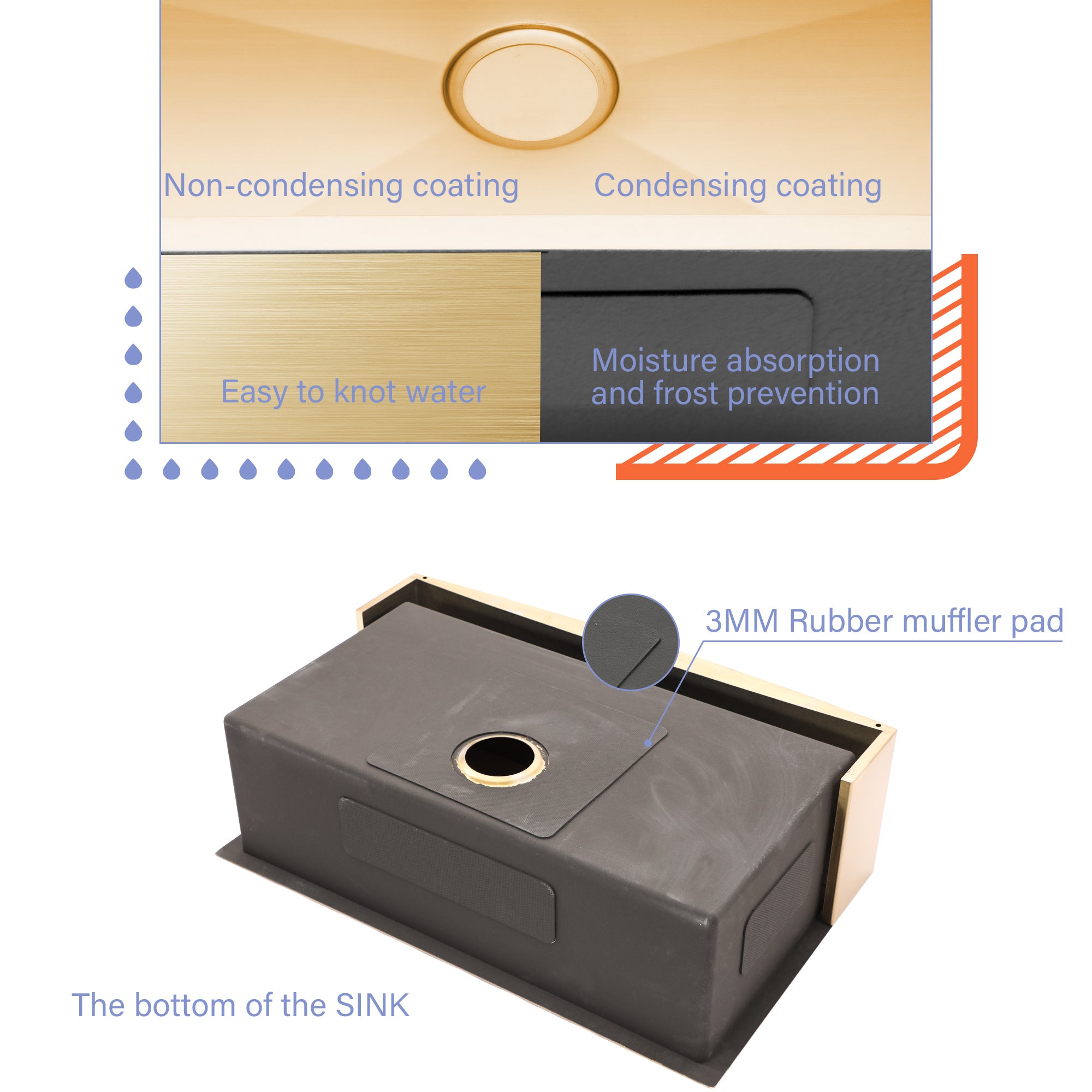 - [T304 Nano Stainless Steel 16G construction] This 30 inch Gold Farmhouse Sink is constructed by heavy duty 16 gauge T304 stainless steel for superior strength and durability.The Gold finish is applied as an outer layer using an innovative nano technique that makes it incredibly tough and resistant to wearing or peeling.Nano surface is repelling to water and oil as lotus leaf, so the kitchen sink is so easy to clean and free of finger print.
