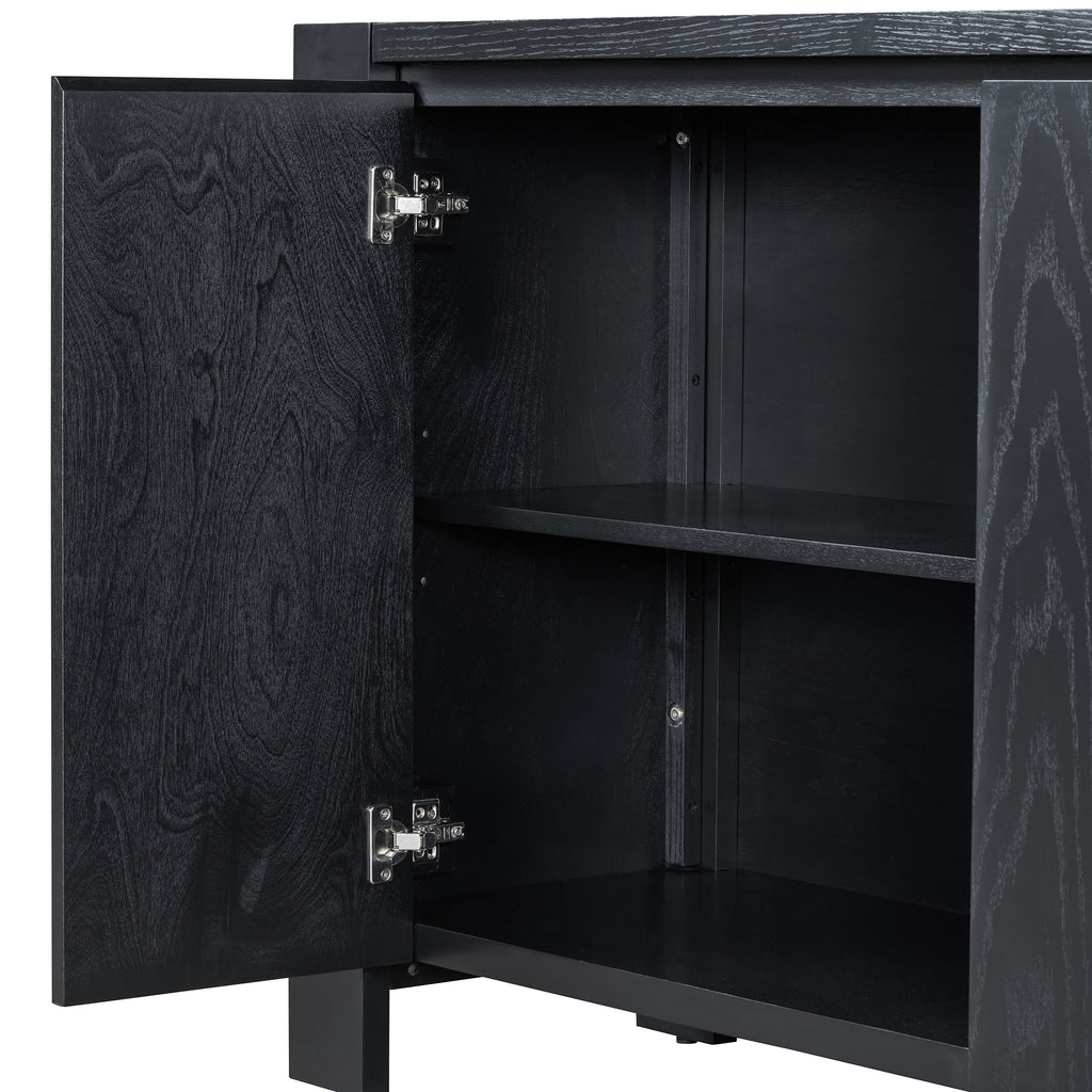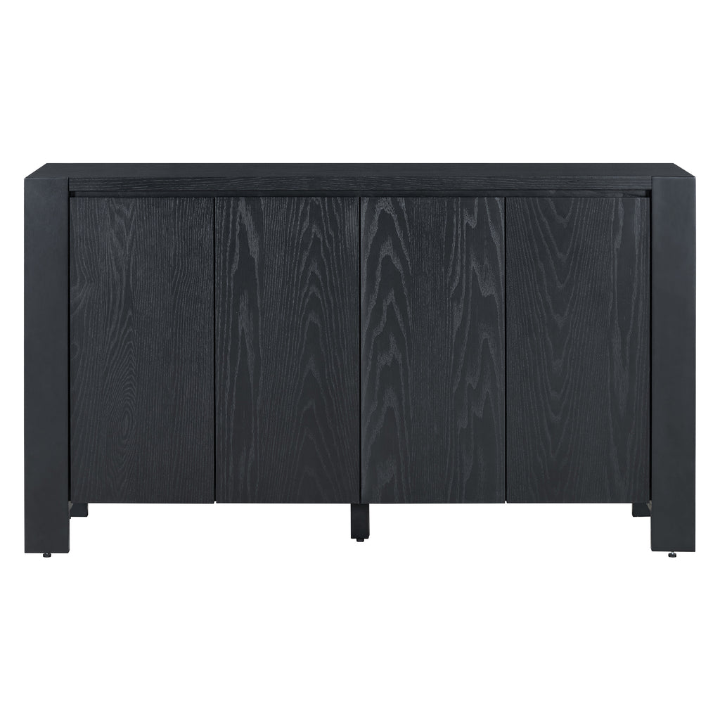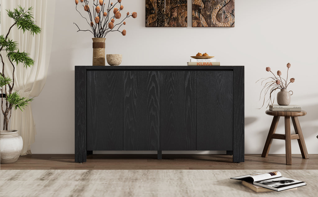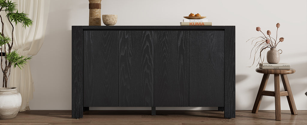 This sideboard buffet cabinet features a symmetrical four-door design, showcasing clean lines. The surface finish of this wood sideboard is a highlight, combining oak veneer with a distressed finish to emphasize the warm, natural texture of wood. Available in three colors—natural, black, and navy—this buffet cabinet with storage adds a touch of rustic elegance to any room.