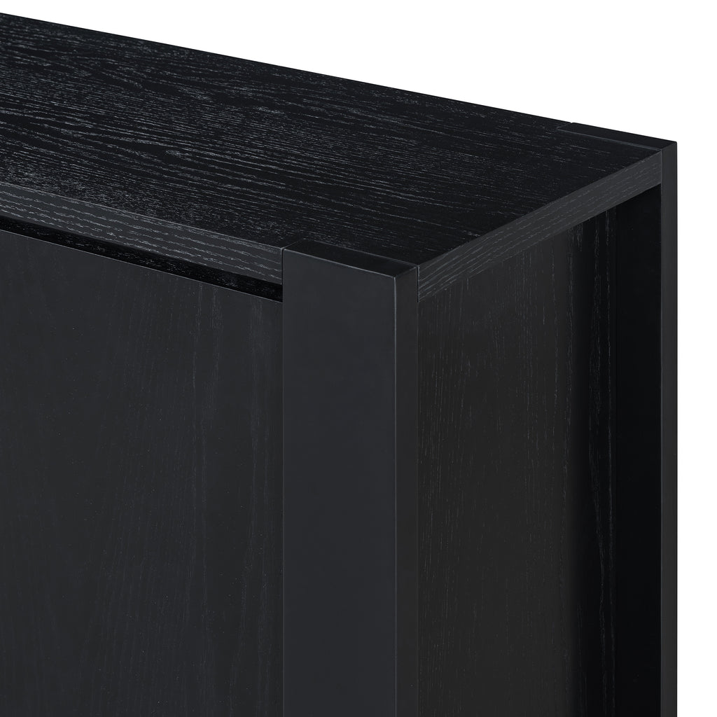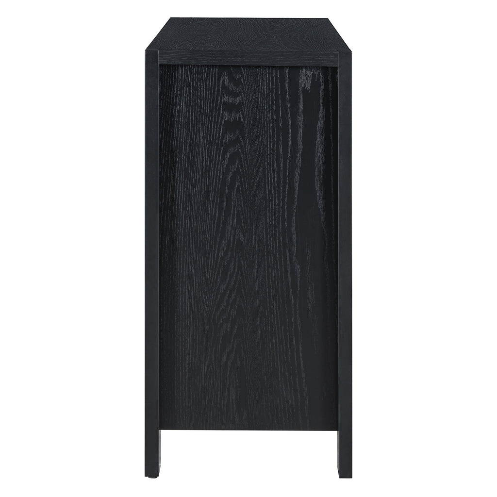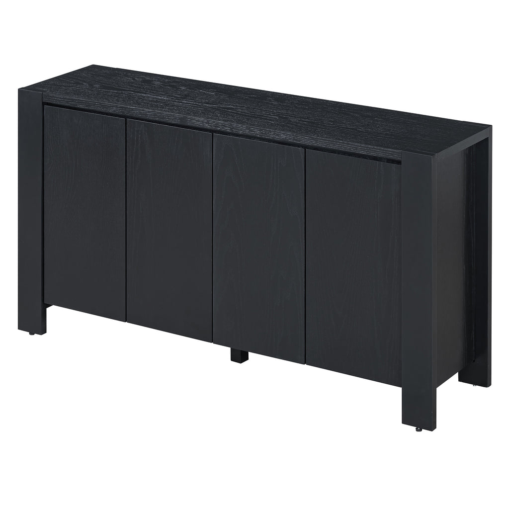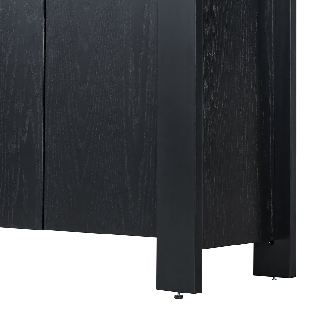 This sideboard buffet cabinet features a symmetrical four-door design, showcasing clean lines. The surface finish of this wood sideboard is a highlight, combining oak veneer with a distressed finish to emphasize the warm, natural texture of wood. Available in three colors—natural, black, and navy—this buffet cabinet with storage adds a touch of rustic elegance to any room.