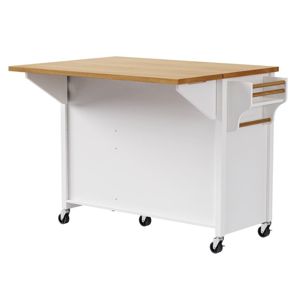 | Summary | This kitchen island is classically elegant. The whole is made up of sturdy and environmentally friendly MDF material with a painted exterior finish and matching OAK veneer tabletop. The raised texture on the surface of the product makes it look atmospheric and the golden handles feel very smooth. This will surely make your kitchen more advanced so that you will be able to prepare food better in the kitchen. Aside from its beauty, this kitchen island will not disappoint you in terms of practicality. This product has 1 large drawer and 4 small drawers, so you can categorize all your items as needed. The towel and spice racks on both sides can be used to hang small items, and with the height-adjustable shelf inside the doors, you can place a variety of items of different sizes as you wish. The top drop leaf can be unfolded or folded to suit the environment. The bottom is equipped with five 360° wheels, two of which are lockable, allowing it to move freely or be stabilized in place. |