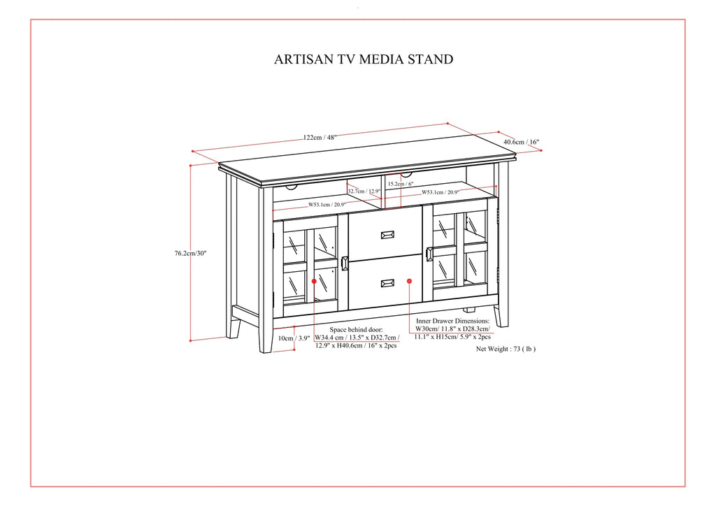 - Features two (2) central drawers with metal glides, open top storage area and two (2) side tempered glass framed doors that open to large storage spaces with one (1) shelf each