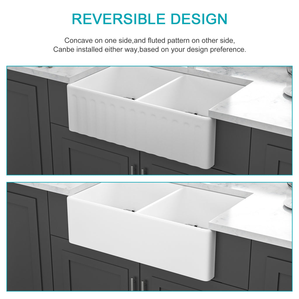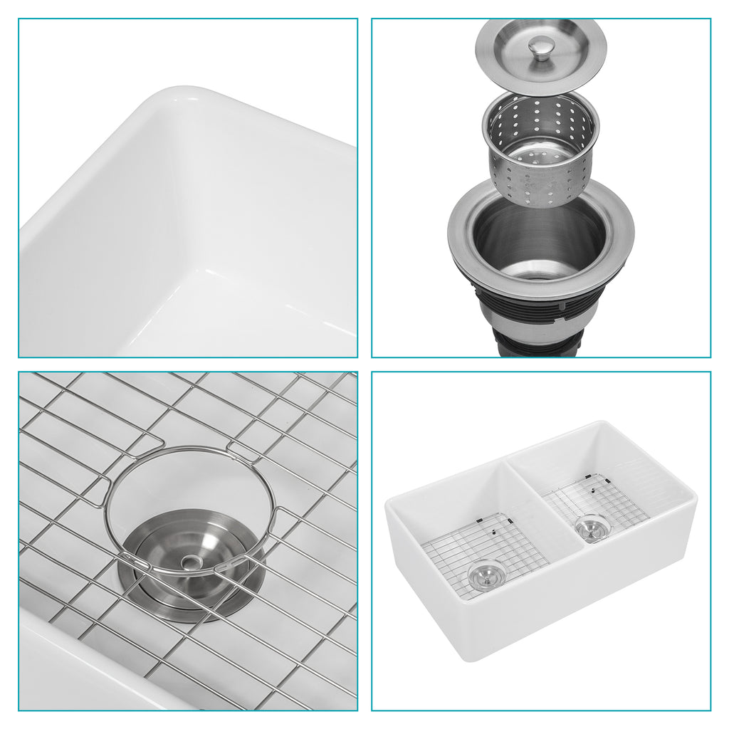 - This 33 inch white farmhouse kitchen sink constructed of ceramic for extreme strength and durability. Kitchen Sink surface is extreme resistance to chips, abrasion or scratches and discoloration for years of beauty and reliable performance.