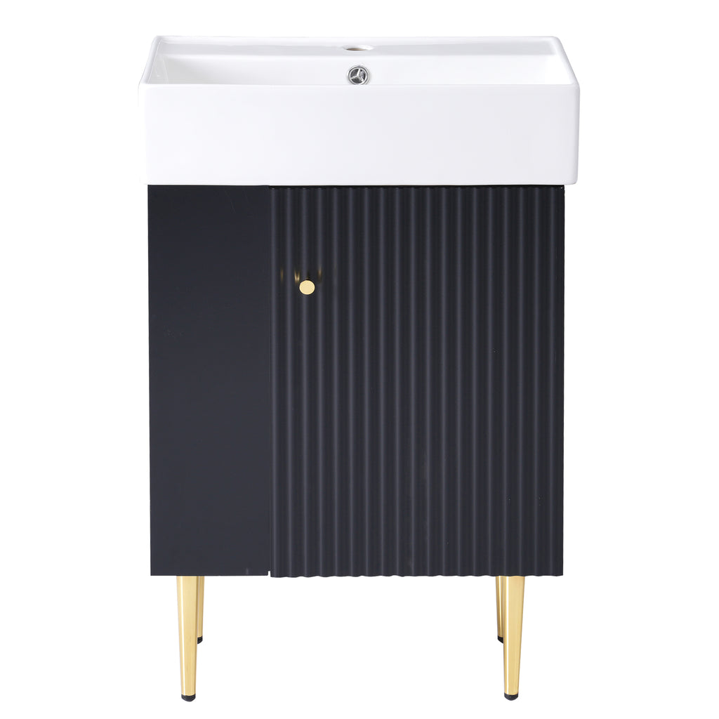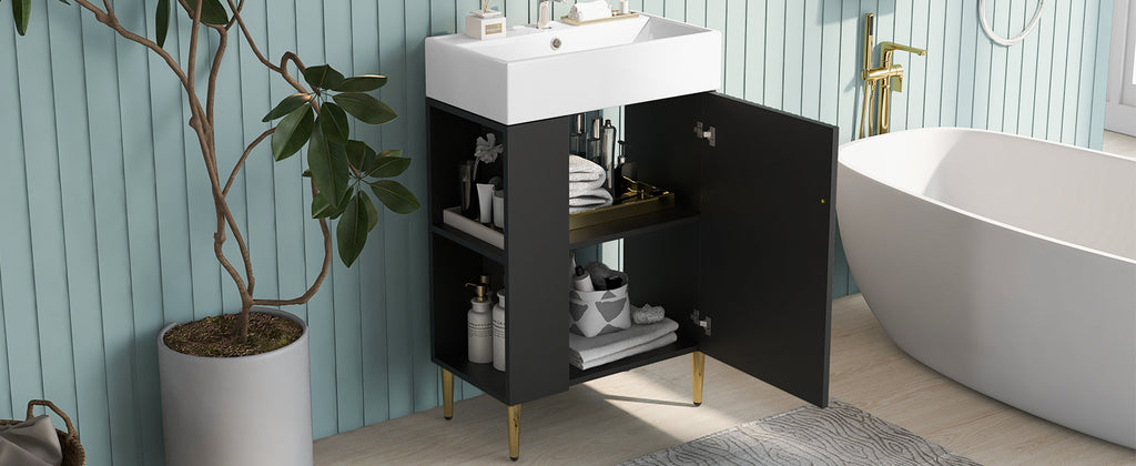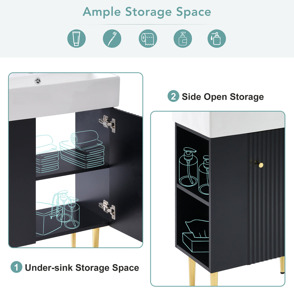 From its rectangle Ceramic top to its contemporary style hand-painted cabinet door, this single bathroom vanity is sure to brighten up your bathroom. Crafted from solid and MDF, this piece features a Ceramic top for a modern look and a clean-lined silhouette. A rectangle under-mount sink gives you a convenient place to wash your hands, while a single-door cabinet with shelf stores all your bathroom essentials. And there is a Side storage cabinet for you to place toilet paper and other supplies.In addition, the elegant golden handles, tapered legs make this bathroom vanity achieve the perfect balance of form and function.