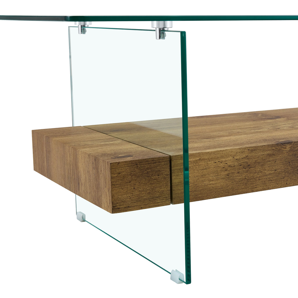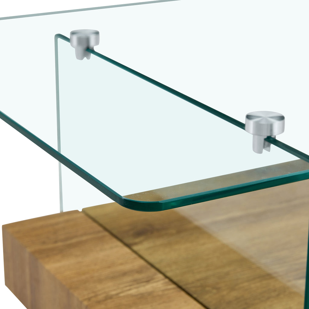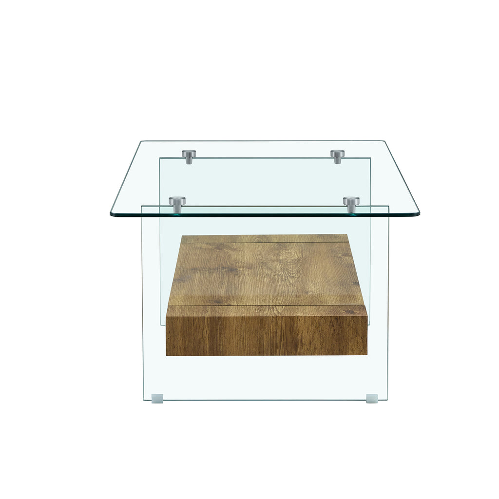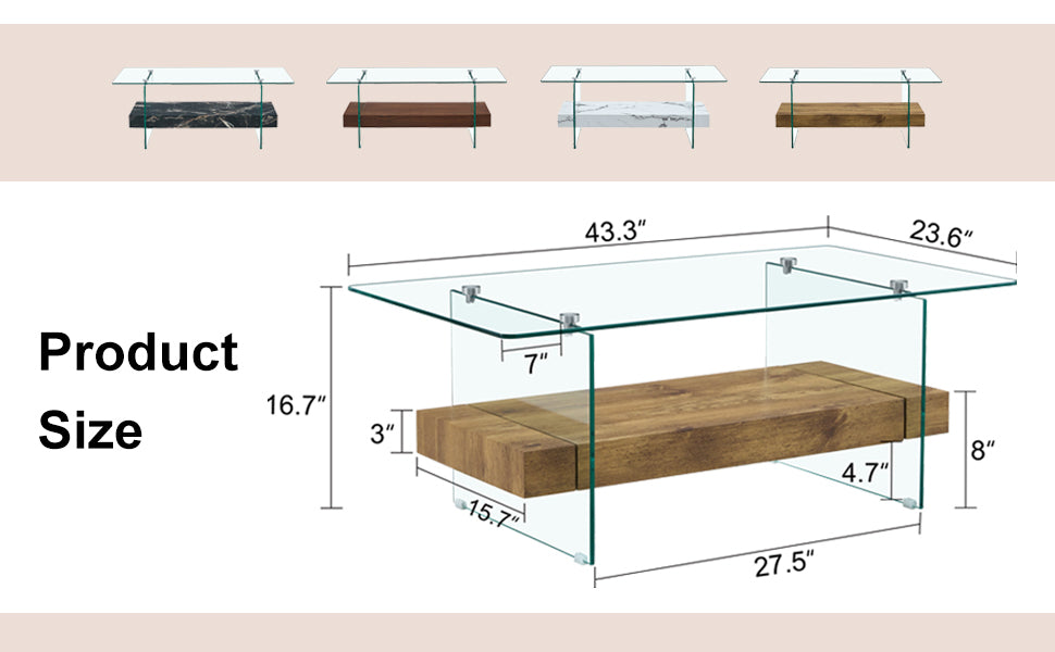 - Two-Tier Design: This coffee table features a two-tier design with a clear tempered glass top for a modern look and a lower tier with MDF covered in light wood texture sticker for added elegance.