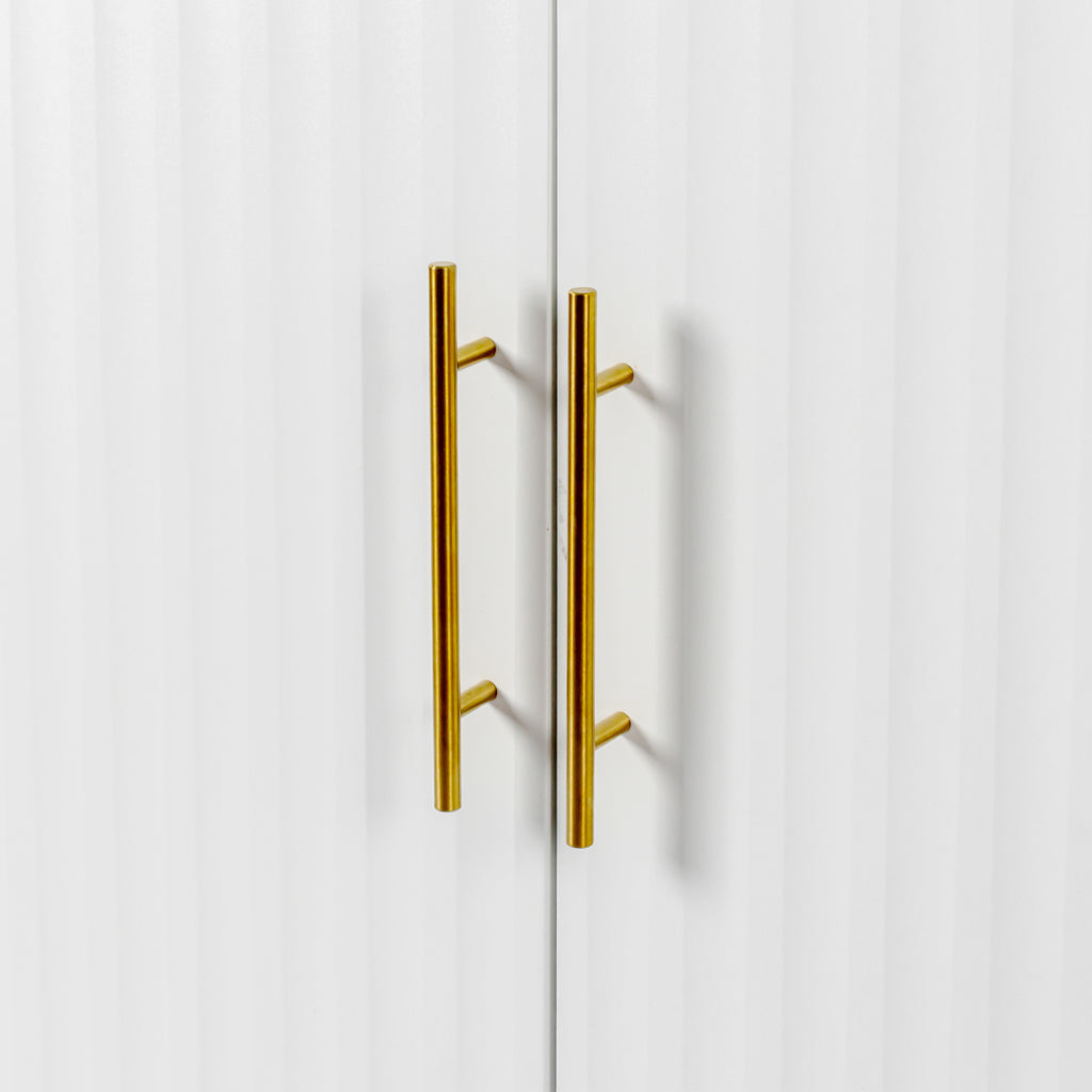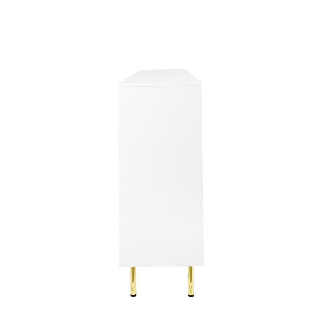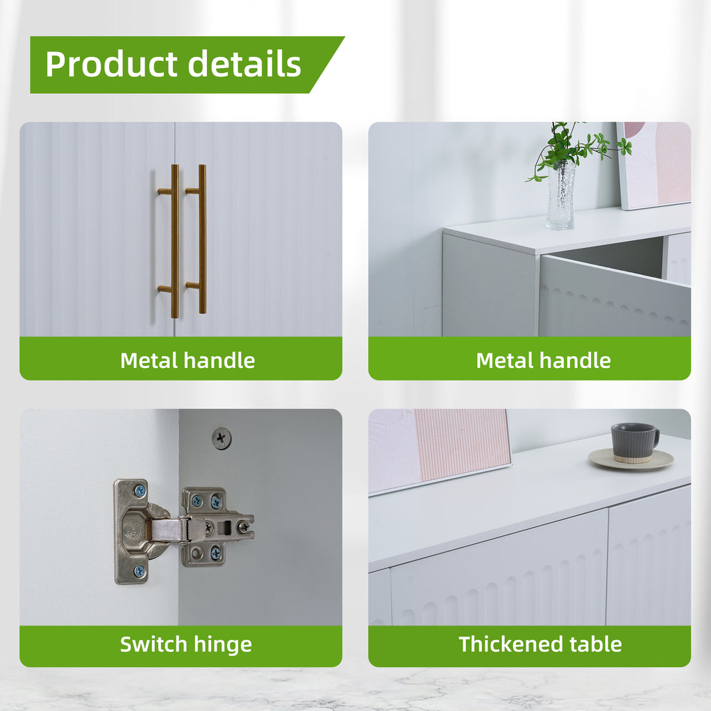 This three-door server not only provides storage space, but also adds style and beauty to the dining room or living room. The unique vertical door design gives the side cabinet a noble and stylish atmosphere, and the slender gold handles complement each other, adding a sense of luxury to the entire cabinet. The interior of this three-door sideboard is cleverly designed, with a two-door cabinet and a cabinet on the right side, each equipped with a shelf. This design makes the maximum use of the storage space of the cabinet. Users can place tableware, cups, wine bottles and other items in an orderly manner according to their needs on different cabinets and shelves, making the whole storage cabinet more tidy and orderly. Pine legs provide stable support for the side cabinets,This accent cabinet features fluted design on each door, enhancing the modern appeal and visual depth of your space, infusing every corner with a stylish and elegant ambiance,Simple design,comfortable gold metal handles. suitable for variety home decoration styles. The versatile design of the cabinet allows it to work well in almost every room of your home, like kitchen, entryway, living room, bedroom.