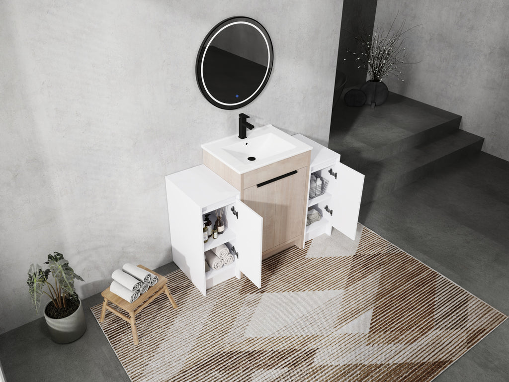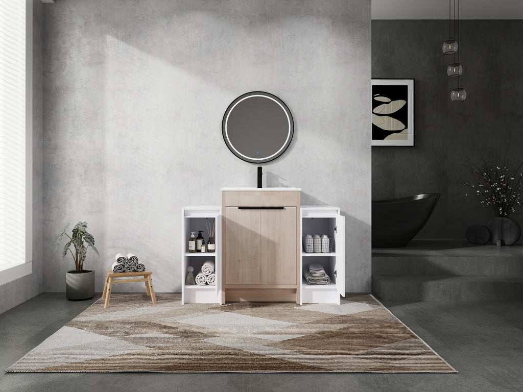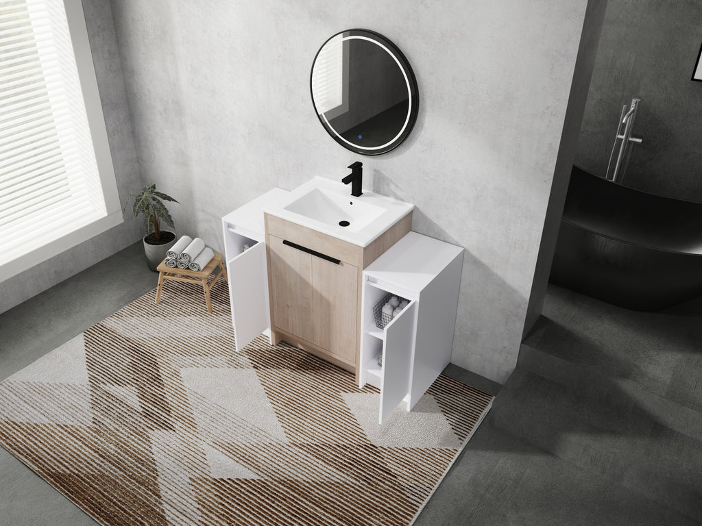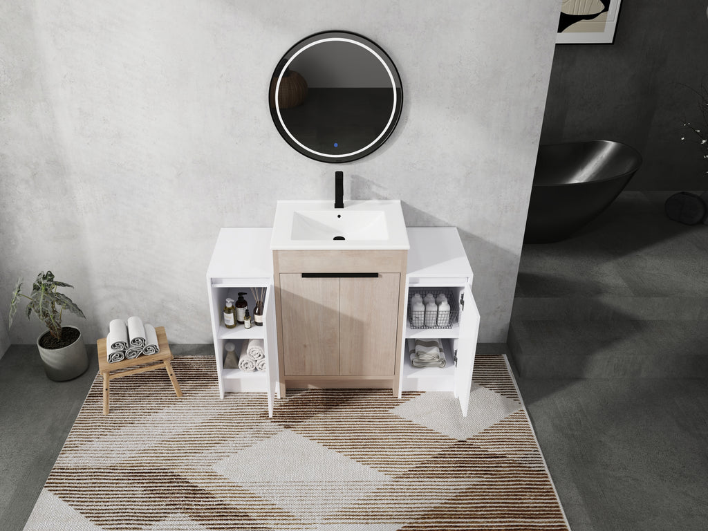 - Bring luxury to your bathroom with our contemporary bathroom vanity. Store all your essentials with ease in the ample bottom storage.