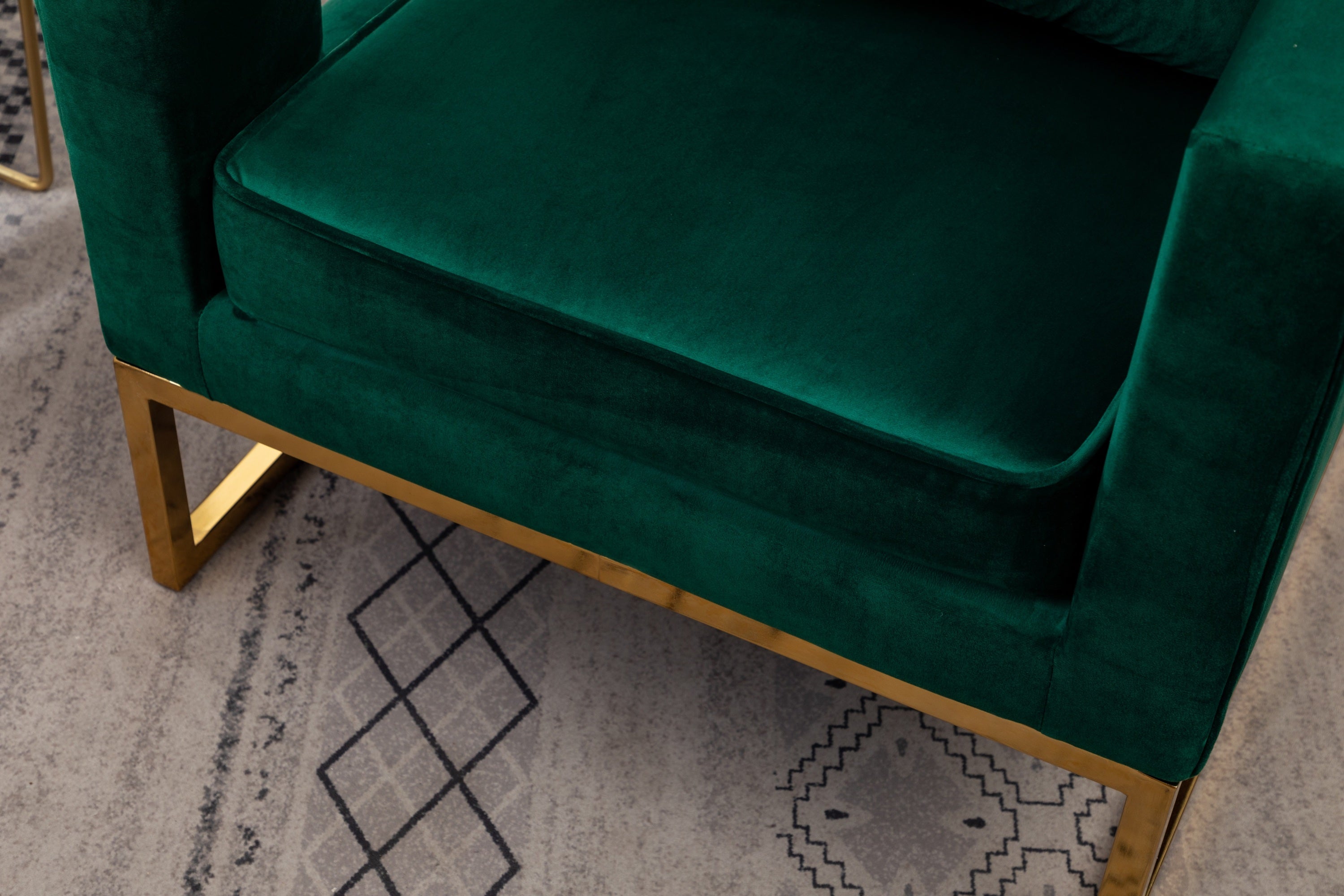 You'll feel at the height of glamorous sophistication sitting in the Lenola Contemporary Upholstered Accent Arm Chair, even though the design is simple and modern. Gold-colored metal tube frame stands out against the luxe upholstery and gives this seat a strong and sturdy base for long-lasting lounging. The square, cut-out arm's, and pillow back design make this chair luxuriously comfy in a decidedly updated aesthetic for an unexpected addition to your home.