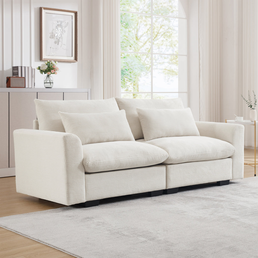 - Superior comfort - extended deep seats allows you to sit cozy on the sofa, soft waist pillow to offer excellent support to your waist, ergonomic seat angle eliminating your fatigue of the day and bringing a full sense of security and comfort. Back and seat cushion are upholstered with comfortable high-density foam cushions for ultimate comfort and support.The back cushions and seat cushions are soft and fluffy, and the stripped corduroy fabric gives it a cloud-like wrapping feel.