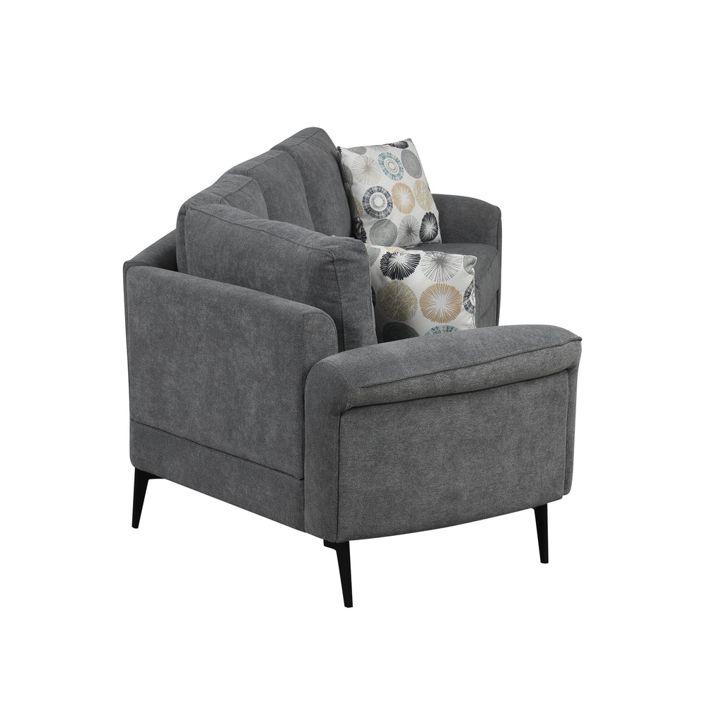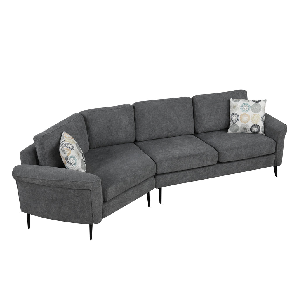 This three-seat sofa offers a perfect combination of style, comfort, and functionality. Its ergonomic armrests are thoughtfully designed with a gentle curve to match the natural contours of the body, ensuring superior support and relaxation. The sleek, curved design adds a touch of elegance and promotes a more relaxed seating posture. Durable metal legs provide sturdy support while elevating the sofa for a light and spacious feel, complementing its modern aesthetic. Additionally, the sofa comes with two removable patterned pillows that enhance its visual appeal and offer practical versatility, as they are easy to clean or swap out for a refreshed look. This sofa is an ideal choice for those seeking comfort, durability, and timeless elegance in their living space.